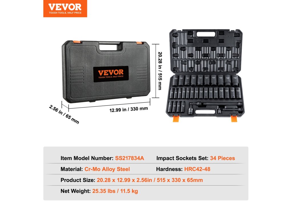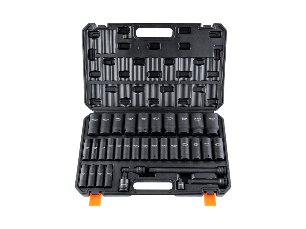 Professzionális és hordozható ütvecsavaros dugókulcs-készletet keres? a 34 darabos VEVOR ütvecsavaros dugókulcs-készlet teljes körű szerszámkészletet kínál, amely különösen alkalmas a különböző autómárkák javításához.