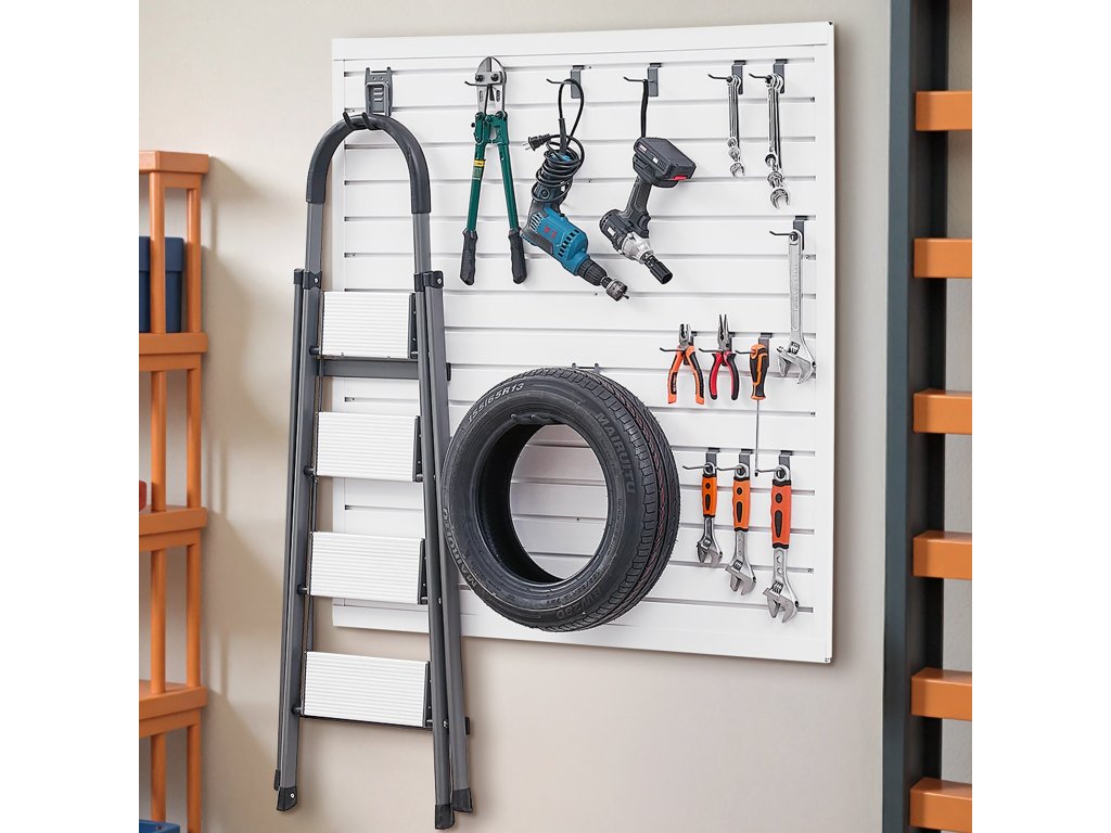 A 3 hüvelyk széles résszel ellátott fali panel kialakítása kompatibilis az univerzális kampókkal, konzolokkal, polcokkal és egyéb tároló kiegészítőkkel, így könnyen hozzáadhatók vagy eltávolíthatók a nagyméretű szerszámok és a kis alkatrészek.