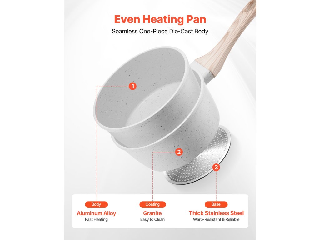A tapadásmentes főzőedény megerősített átlátszó üvegfedéllel rendelkezik a könnyű ellenőrzés érdekében, meghosszabbított peremmel a leves vagy tej csepegésmentes kiöntéséhez, valamint csavarokkal rögzített, megerősített fogantyúval a stabilitás érdekében. A fogantyú könnyen felszerelhető, és tartósan megépített.