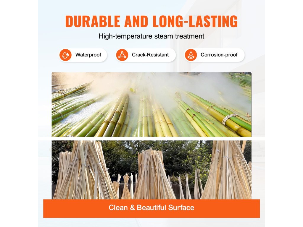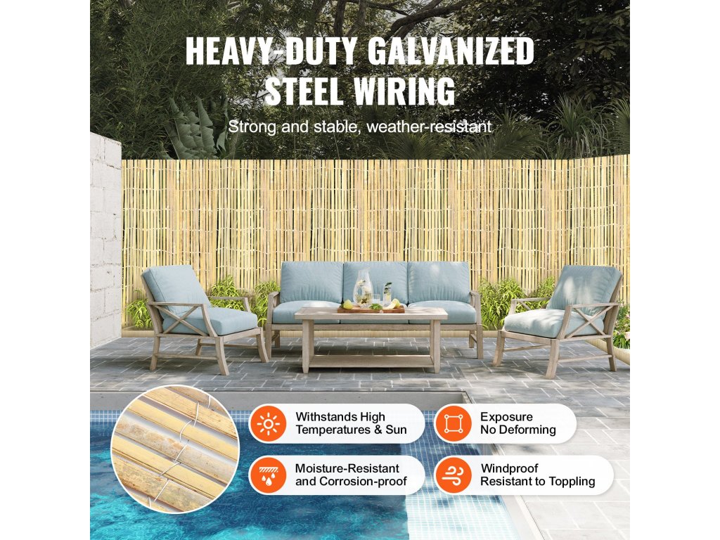 Minden bambuszrúd hagyományos kezelésen esik át, beleértve a magas hőmérsékleten történő gőzölést, mosást és természetes szárítást. Vastag horganyzott acélhuzalokkal összekötve a bambuszkerítés korrózióálló és erős szerkezetet biztosít, meghosszabbítva ezzel az élettartamát.