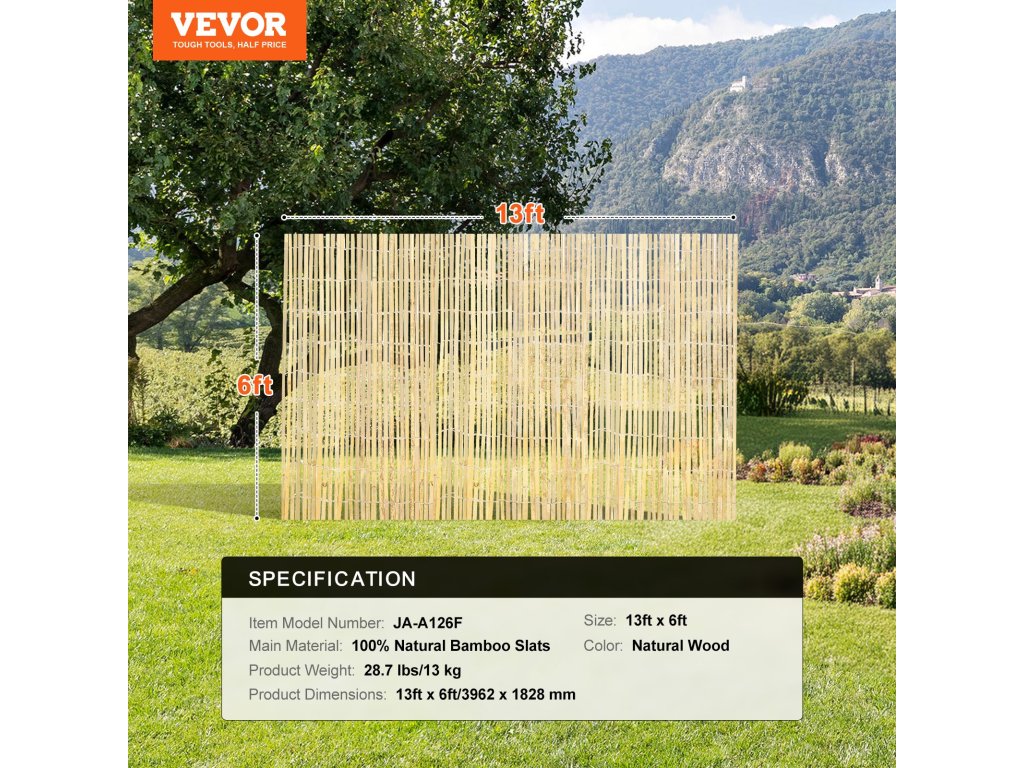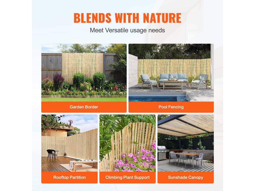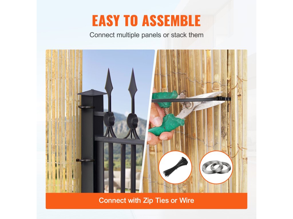 Egyszerűen nyissa ki a csomagot, és rögzítse a bambuszfalat kötőelemek (például zip-kötegelő vagy drót) segítségével. Gyorsan telepíthető sík vagy ívelt felületekre, és nagyobb vagy biztonságosabb és privát telepítésekhez összeilleszthető vagy átfedhető.