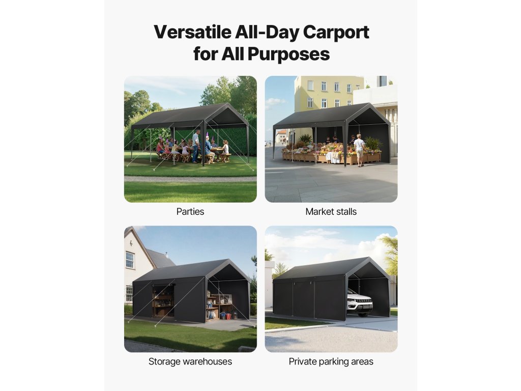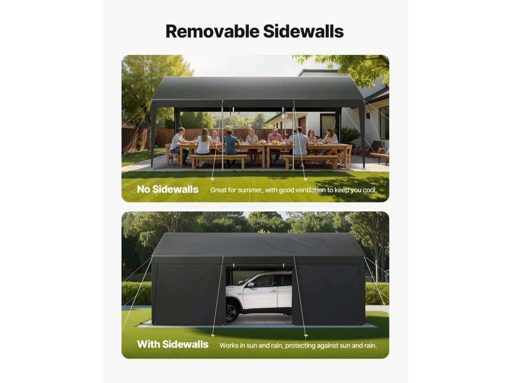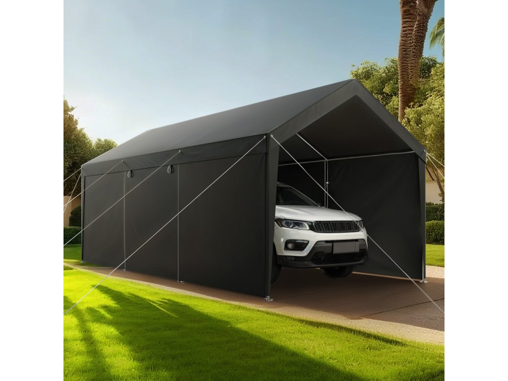 A kocsibeálló 10×20 láb méretű területet kínál horganyzott acélvázzal és PE-bevonatú, kétrétegű ponyvával, amely egész évben védelmet nyújt a nap, az eső és a szél ellen járműve és kültéri tárgyai számára. Gyorsan összeszerelhető és hosszú élettartamra tervezett, Ideális garázsba, tárolóhelyre vagy szabadtéri tevékenységi területre.