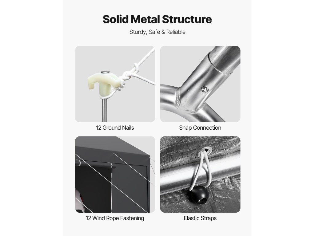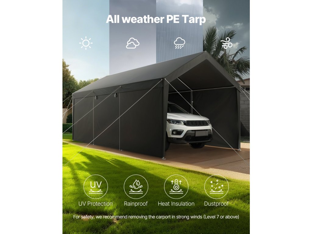 A kiváló minőségű PE-szövetből készült hordozható garázs egész évben védelmet nyújt a napsugarak, az eső, a hó és a homokviharok ellen. Legyen szó intenzív napsütésről, heves esőzésről vagy téli havazásról, a garázs száraz és tiszta marad, és védelmet nyújt járművének.