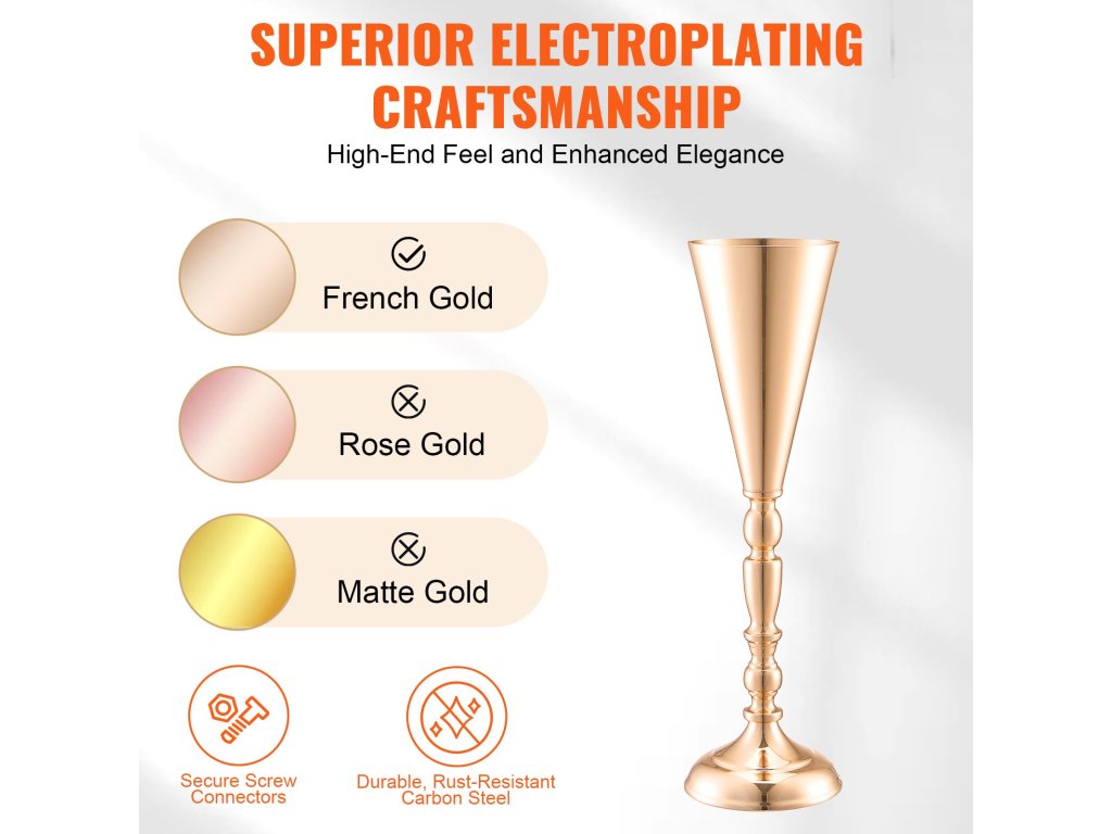 10 darabos fém esküvői virágtartó szett, magasság 43 cm, arany színű