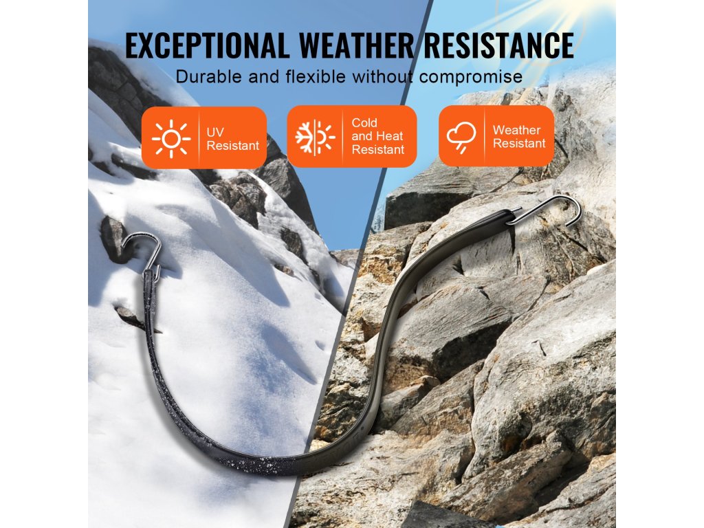 A kivételes időjárásállóságnak köszönhetően ezek a strapabíró bungee hevederek még zord körülmények között is megőrzik teljesítményüket, hosszú élettartamot és megbízható stabilitást biztosítva.