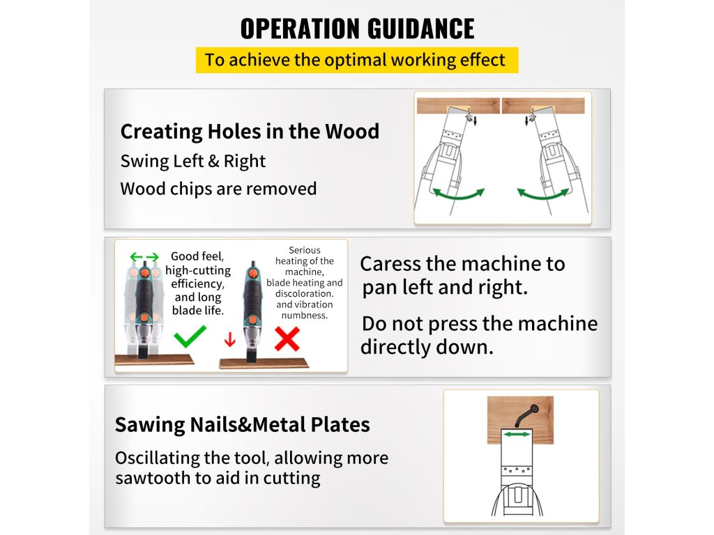 A fűrészlapot izzadás nélkül be lehet szerelni. Szögek és fémlemezek vágásakor rezgesse a szerszámot, így több fűrészfog segíti a vágást.