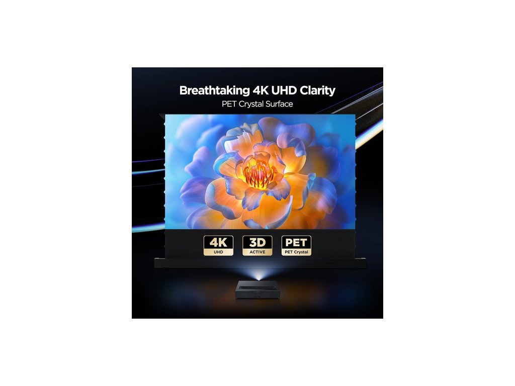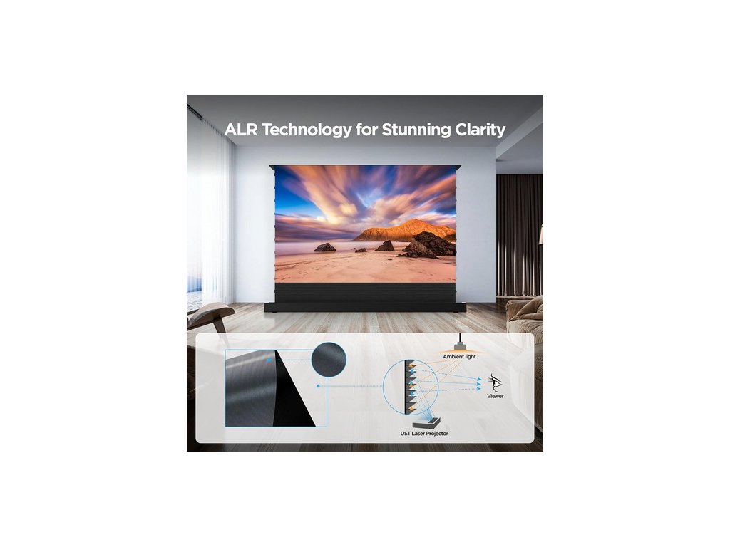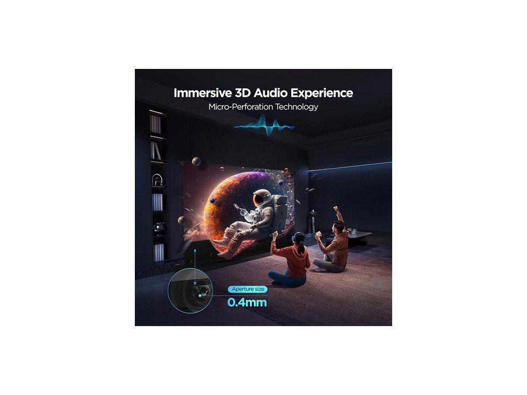 A PET kristályfelület és a prémium PVC anyag tartós és fényálló, megőrizve az eredeti képminőséget. A széles, 170°-os betekintési szög biztosítja, hogy a kép minden szögből egyenletesen tiszta legyen. A széleken lévő szálak sima, ráncmentes képernyőt biztosítanak a simább kép érdekében. A 0,4 mm-es mikroperforált felület tiszta hangátvitelt biztosít minimális fényveszteséggel, így magával ragadó audiovizuális élményt nyújt. A fényvisszaverő kijelző kiküszöböli a szemet érő közvetlen fényt, így hosszabb ideig kényelmes és fáradtságmentes nézést biztosít.