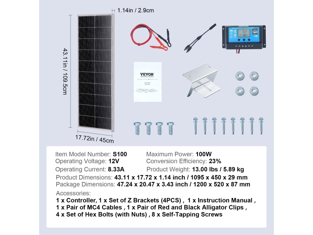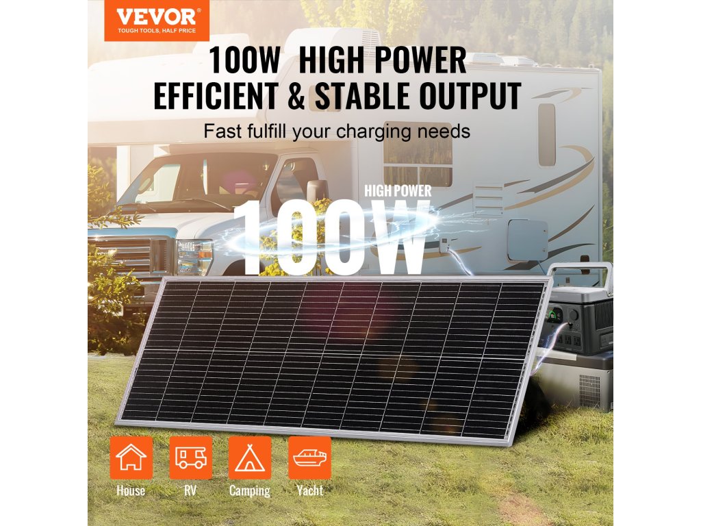 Javítsa életmódját a nagy teljesítményű VEVOR 100 W-os monokristályos napelemmel + töltésvezérlővel. A monokristályos napelemekkel és a magas, 23%-os konverziós aránnyal büszkélkedő készülék ellátja otthonát, lakóautóját és jachtját a kempingfelszerelésének energiaellátásához, kompatibilis a különböző AGM, GEL, FLD és LI akkumulátorokkal.