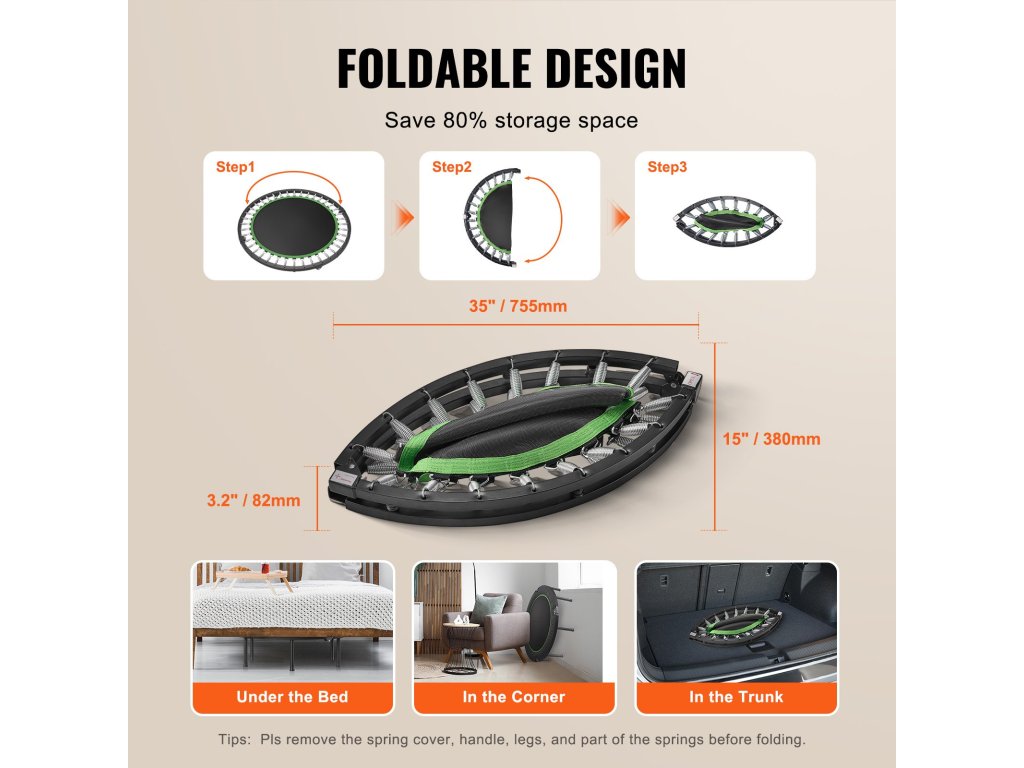 Optimalizálja a tárolási helyet egy olyan edzőtrambulin segítségével, amely eredeti méretének 80%-ára összehajtható. Könnyedén tárolhatja ágyak, kanapék alatt, sarkokban vagy akár az autó csomagtartójában.