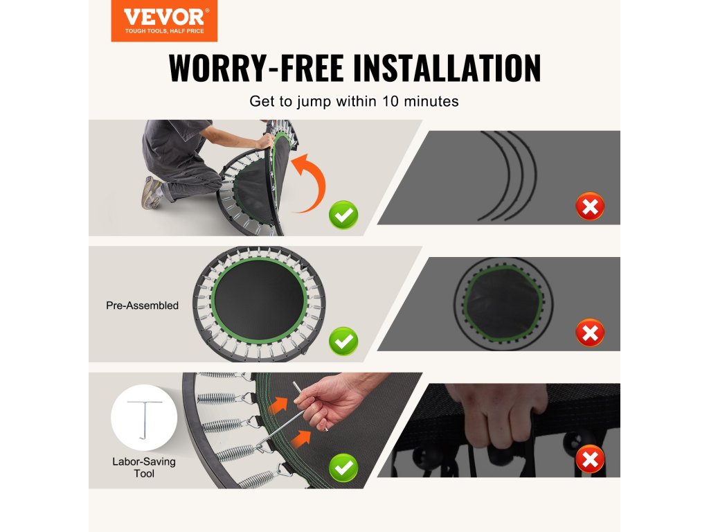 Ez a megerősített acélból és megerősített lábakból készült mini trambulin minden edzés során egyenletes és megbízható teljesítményt garantál.