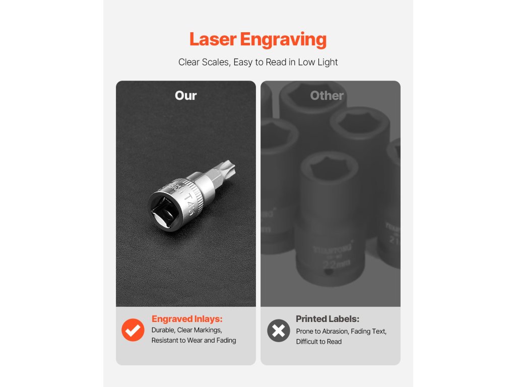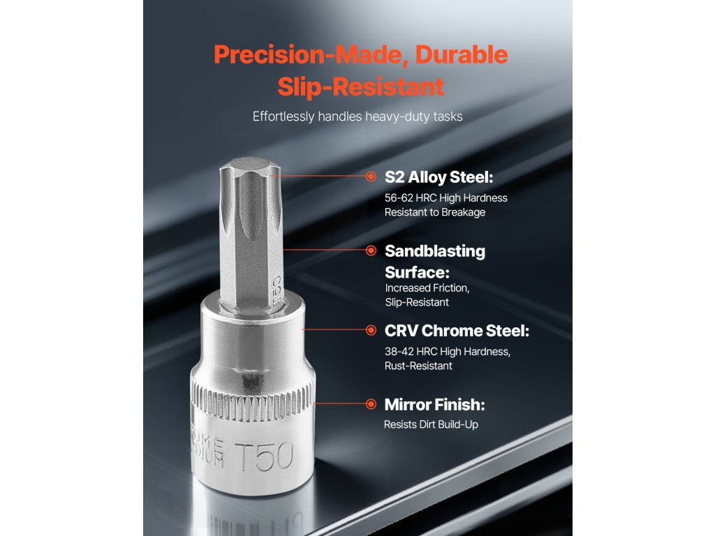 A Torx dugókulcskészlet nagy szilárdságú ötvözött acélból készült, és úgy tervezték, hogy használat közben ne törjön el, így csökkentve a javítások során bekövetkező balesetek kockázatát. A bitek korrózióállóságra kifejlesztett felületkezelése biztos fogást biztosít, és megakadályozza a csúszást a nagy nyomatékú alkalmazások során.