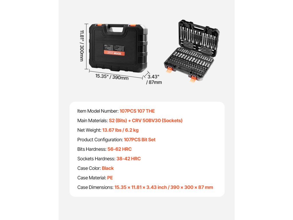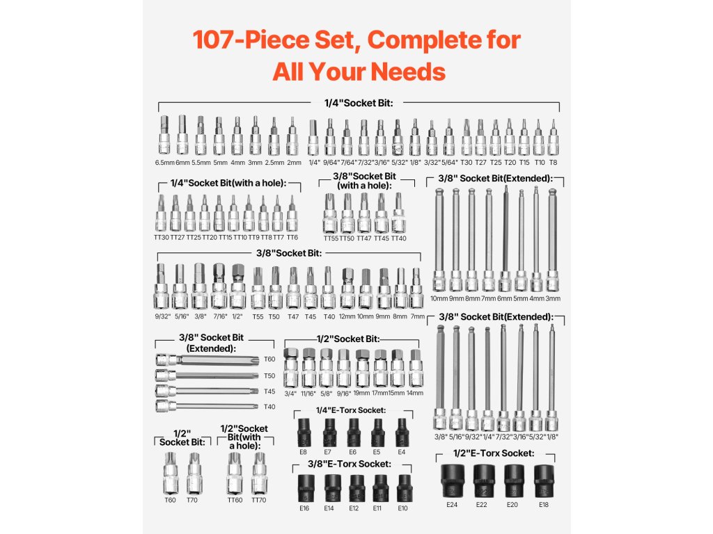 107 darabos bitkészlet, SAE/metrikus, imbusz/torx, s2/cr-v, 1/4–1/2 hüvelyk