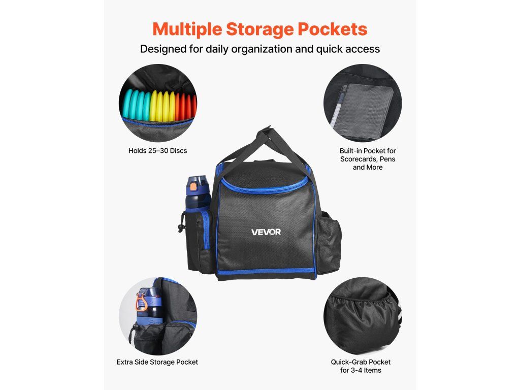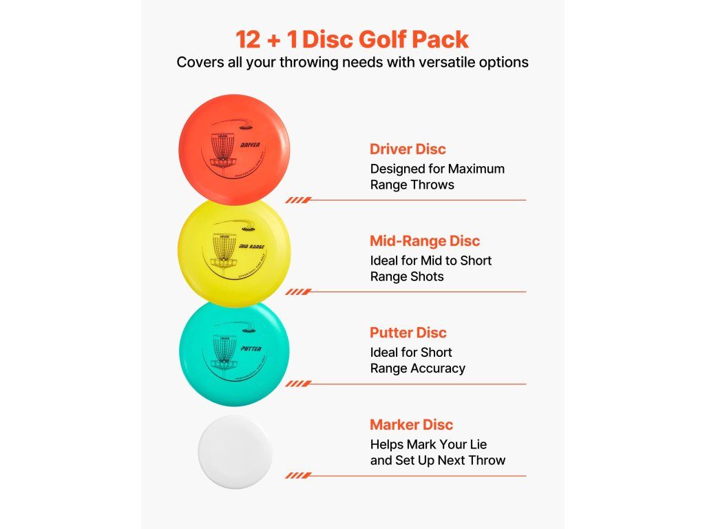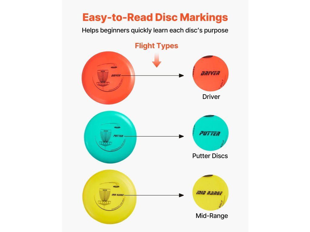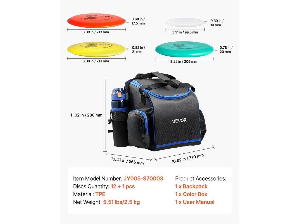 Ez a discgolf kezdő készlet többféle repülési stílust tartalmaz, hogy megfeleljen a különböző dobási igényeknek. A korongok tartós TPE-ből készültek, és ellenállnak a vetemedésnek. A hátizsák 3 zsebbel rendelkezik a kisebb tárgyak tárolására. Minden korong egyedi mintákkal és egyértelmű címkékkel van ellátva. Ideális parkokba, pázsitra, strandokra, kertekbe.