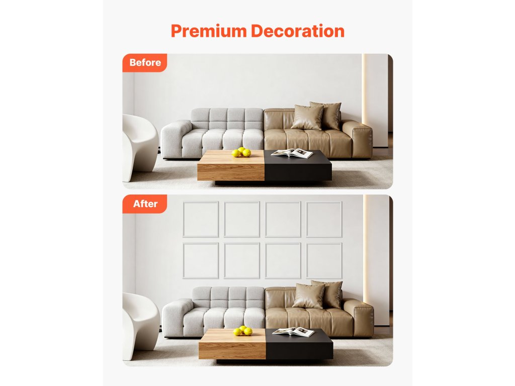 Ez a fali díszléc készlet előre kivágott díszlécrészeket tartalmaz a zökkenőmentes és egyszerű felszerelés érdekében. Akár egy hétvégére bérelt lakást újít fel, akár egy életre szóló otthonát korszerűsíti, minden részletet úgy terveztünk, hogy már az első próbálkozással magazinos eredményt érjen el.