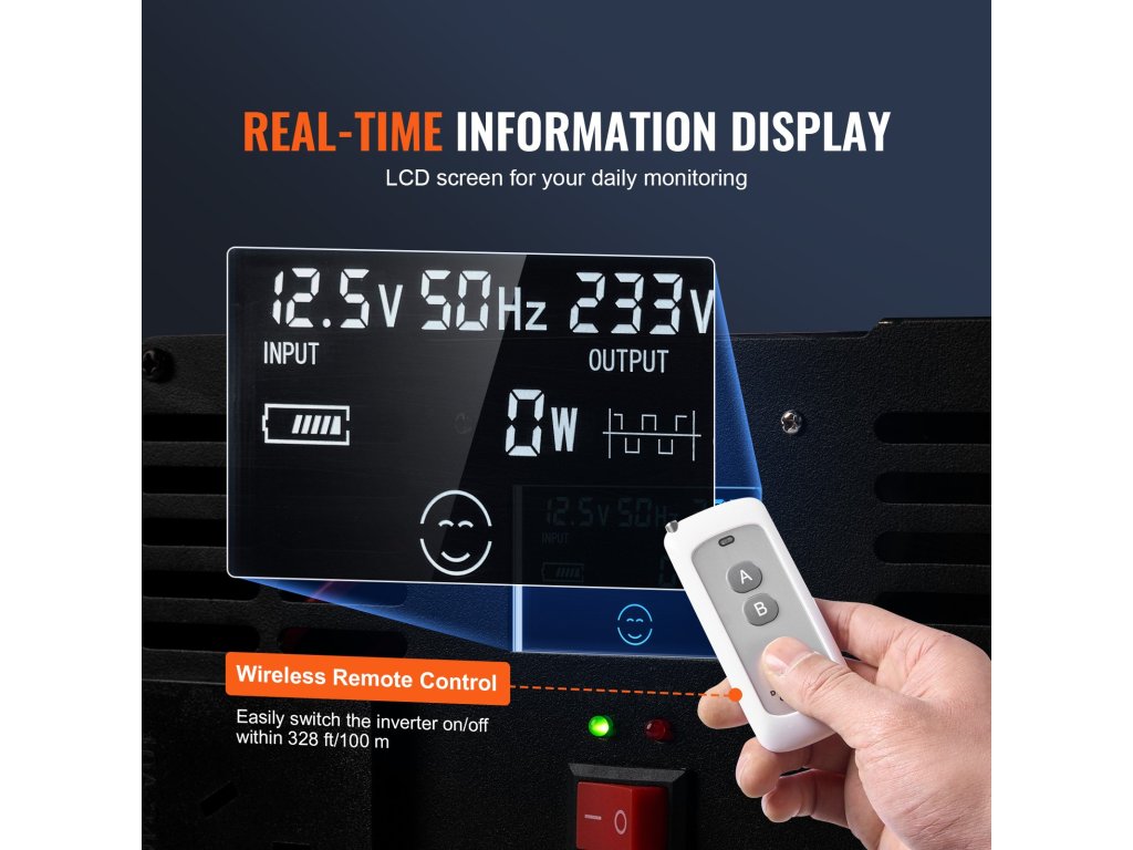 Az energiaátalakítónk távirányító funkciójával a kényelem csak egy kattintásra van. Még akkor is, ha az invertere nehezen hozzáférhető helyen van felszerelve, távirányítónkkal könnyedén be- és kikapcsolhatja az áramot 100 méteres hatótávolságon belül. Élvezze az inverter távvezérlésének szabadságát!
