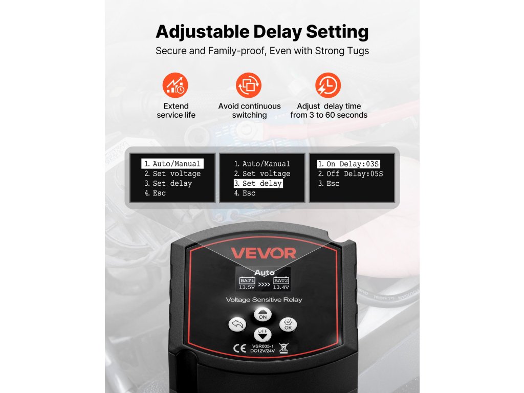 A feszültségérzékeny relénk nemcsak a rugalmas feszültségbeállítást és a vészhelyzeti fordított töltést támogatja, hanem beépített késleltetési védelemmel is rendelkezik a gyakori indításból és leállításból eredő veszteségek elkerülése érdekében. A valós idejű kettős feszültségkijelzővel együtt folyamatosan tájékoztatja Önt az akkumulátor állapotáról a megbízható használat érdekében.