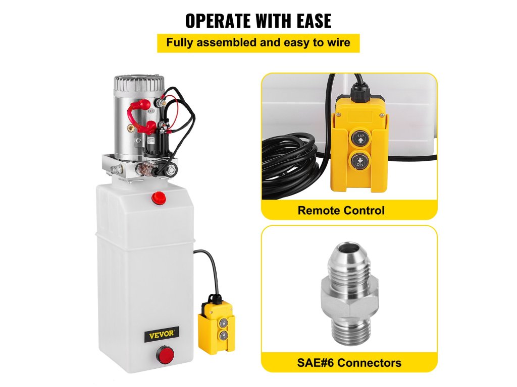 Hidraulikus elektromos szivattyúnk teljesen összeszerelt. Kézi távirányítóval és 1 további SAE#6 csatlakozóval szállítjuk a cseréhez. A teljes meghajtóegység könnyen csatlakoztatható és könnyen kezelhető.