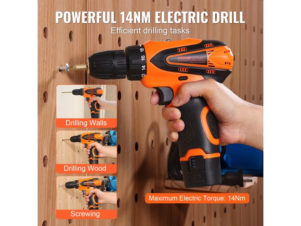 Az otthoni szerszámkészlet tartalmaz egy nagy teljesítményű, 14 Nm nyomatékú elektromos fúrót és több fúrófejet a különböző fúrási igények kielégítésére, így különböző helyzetekben megtalálhatja a megfelelő szerszámot.