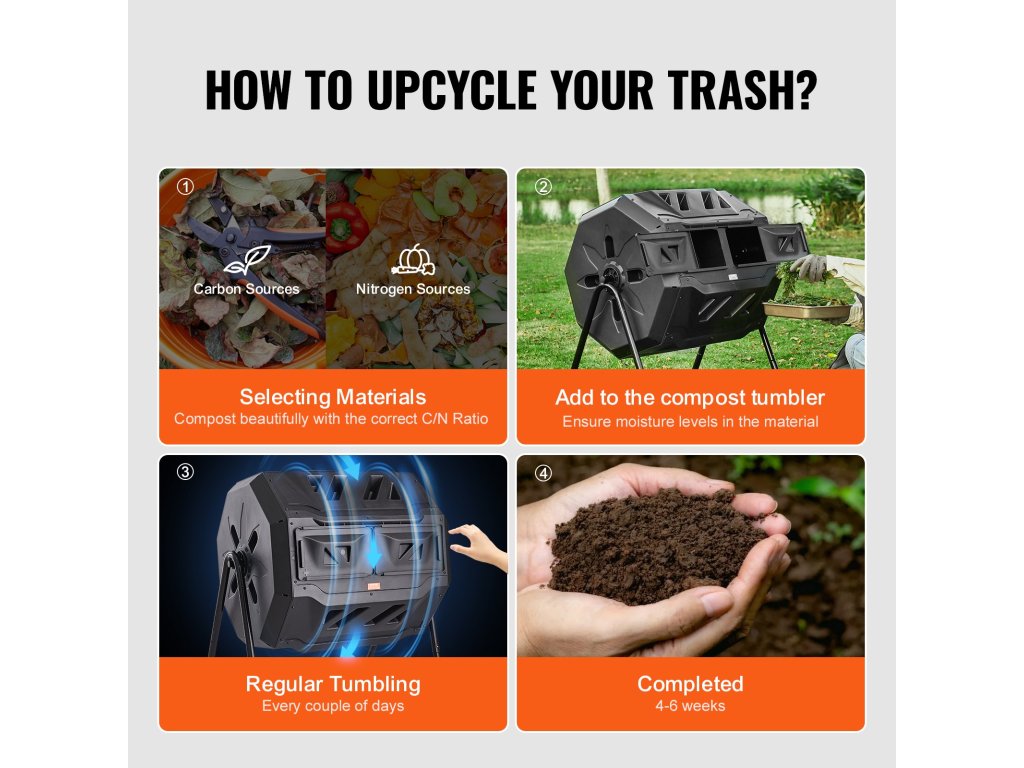 A kerti komposztgyűjtő 360°-ban megfordítható kialakítású; nincs szükség kézi keverésre. A rendszeres forgatással optimális komposztálási eredményt ér el, és példátlan kényelmet kínál a kertészkedés során.