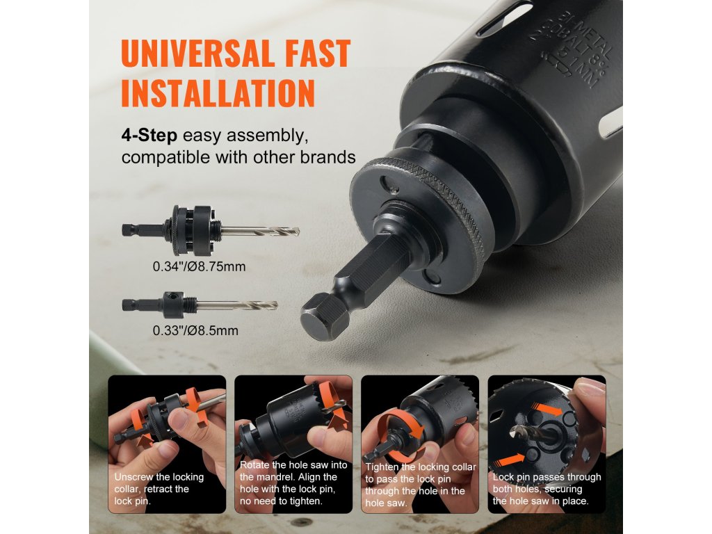 Ez a bimetál lyukfűrészkészlet egyszerű összeszereléssel rendelkezik. Egyszerűen helyezze be a lyukfűrészt az elektromos szerszámába, és máris készen áll. Az egyszerű beállítással időt takaríthat meg, és könnyedén elvégezheti munkáit.