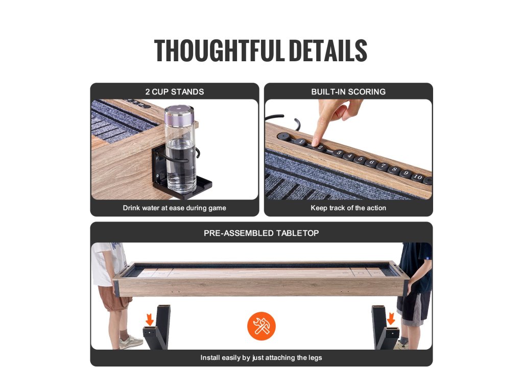 A felnőtt társasjátékok 2 pohártartót tartalmaznak, így könnyen kéznél tarthatja az italokat. A beépített pontozás segít nyomon követni a játékot, így a játékra koncentrálhatsz. Az előre összeszerelt asztallap azt jelenti, hogy csak a lábakat kell felerősítenie, így a felállítás egyszerű és gyors.