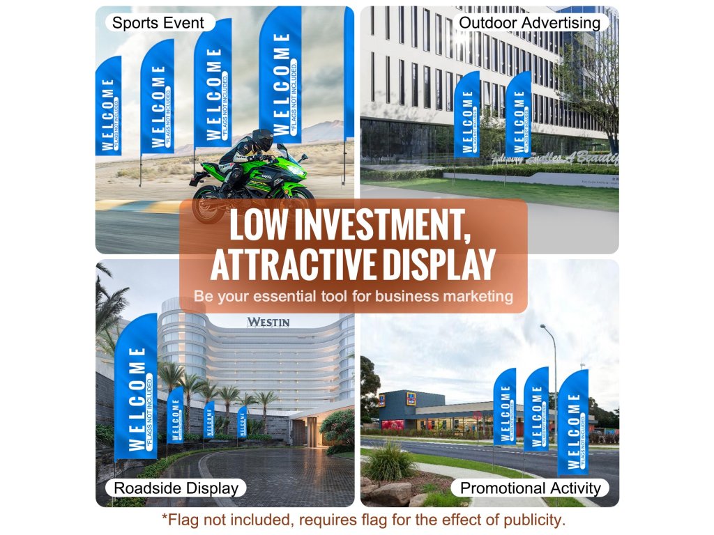 A különböző tollas és könnycseppes zászlókhoz tervezett reklámzászlórudak ideálisak szabadtéri rendezvényekhez, kiállításokhoz, sportversenyekhez és nagy nyilvános összejövetelekhez. Bár a zászló nem tartozék, a zászlórúdkészlet számos zászlóstípussal kompatibilis.