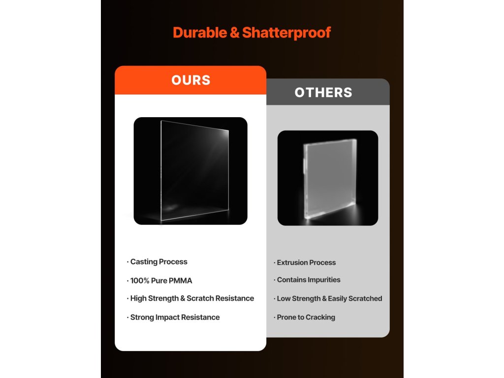 Minden egyes lap 24 x 36 hüvelyk méretű, 1/4 hüvelyk (6 mm) vastag, és prémium PMMA anyagból készül, 100% tisztaságú MMA-val a kiváló tisztaság és szilárdság érdekében. Könnyen vágható, fúrható vagy forrón hajlítható, így tökéletes barkácsmunkákhoz, esküvői táblákhoz, bútorpolcokhoz, védőfalakhoz és még sok máshoz!