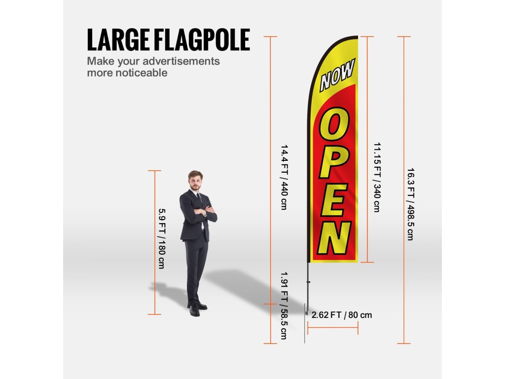 A 14,4 láb/440 cm-es magassággal és 16,3 láb/498,5 cm-es teljes magassággal rendelkező Feather zászlórúd készletünk tökéletesen párosul a 11,15 x 2,62 láb méretű zászlórúddal. A nagy méret növeli a vizuális hatást és a márka felismerhetőségét, így hirdetése kiemelkedik a versenytársak közül.