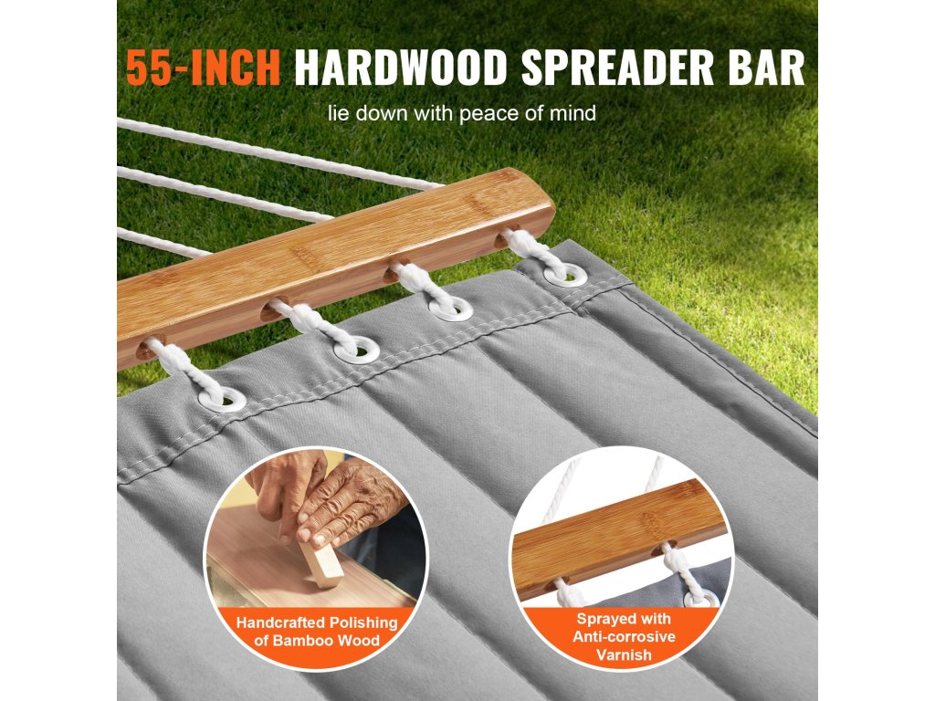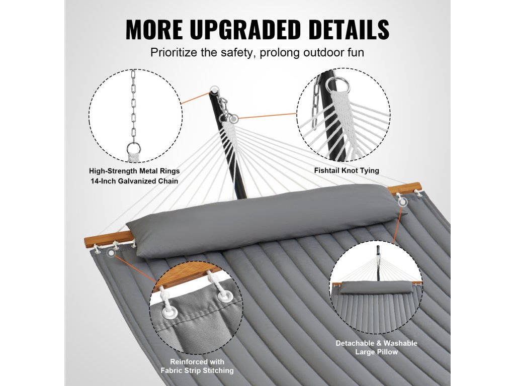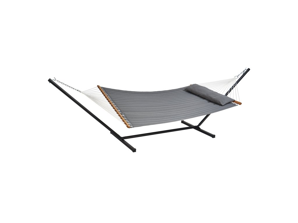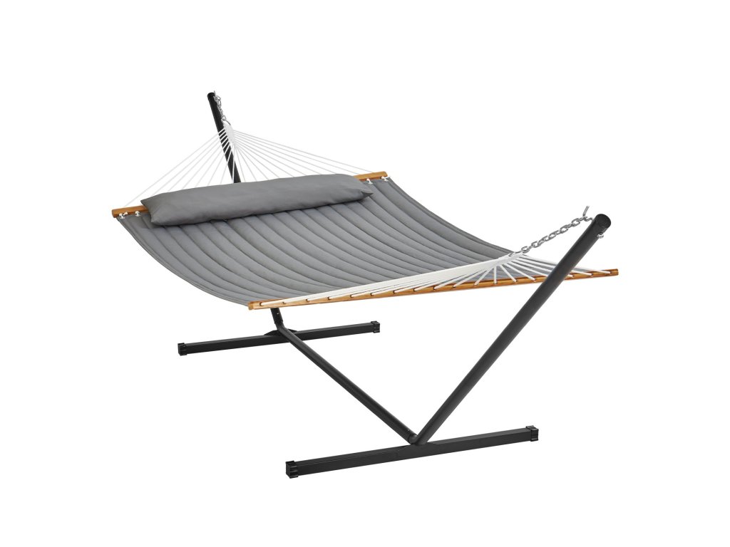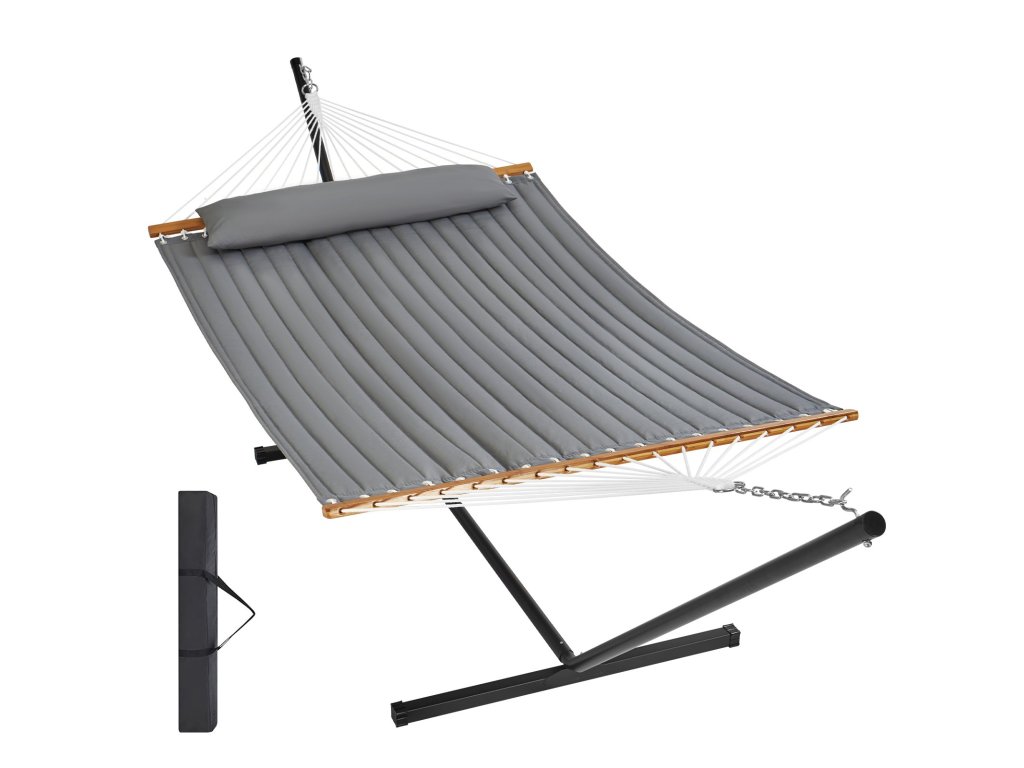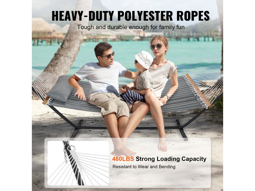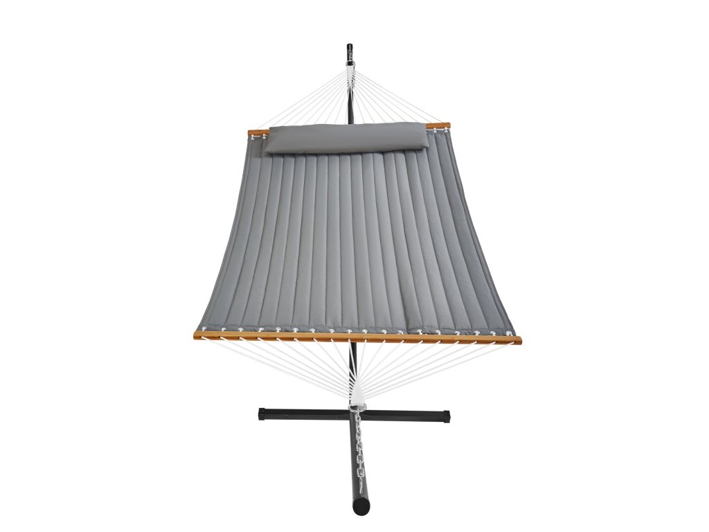 Robusztus és megbízható, dupla steppelt hintánkat 18 erős, kézzel szőtt kötéllel támasztjuk alá, hogy biztonságos élményt nyújtson. Megerősített halcsomókkal és fémgyűrűkkel akár 480 fontot is elbír, tágas, 75 x 55 hüvelykes ágyán pedig kényelmesen elfér két ember.