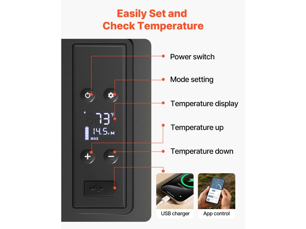 A fedélzeti hűtőszekrény a hőmérsékletet és az üzemmódot egy digitális panelen keresztül szabályozhatja, amely bármikor ellenőrizheti a hőmérsékletet és a teljesítményt. A hőmérséklet szabályozására a mobilalkalmazást is használhatja, a töltéshez pedig USB-csatlakozót biztosít.