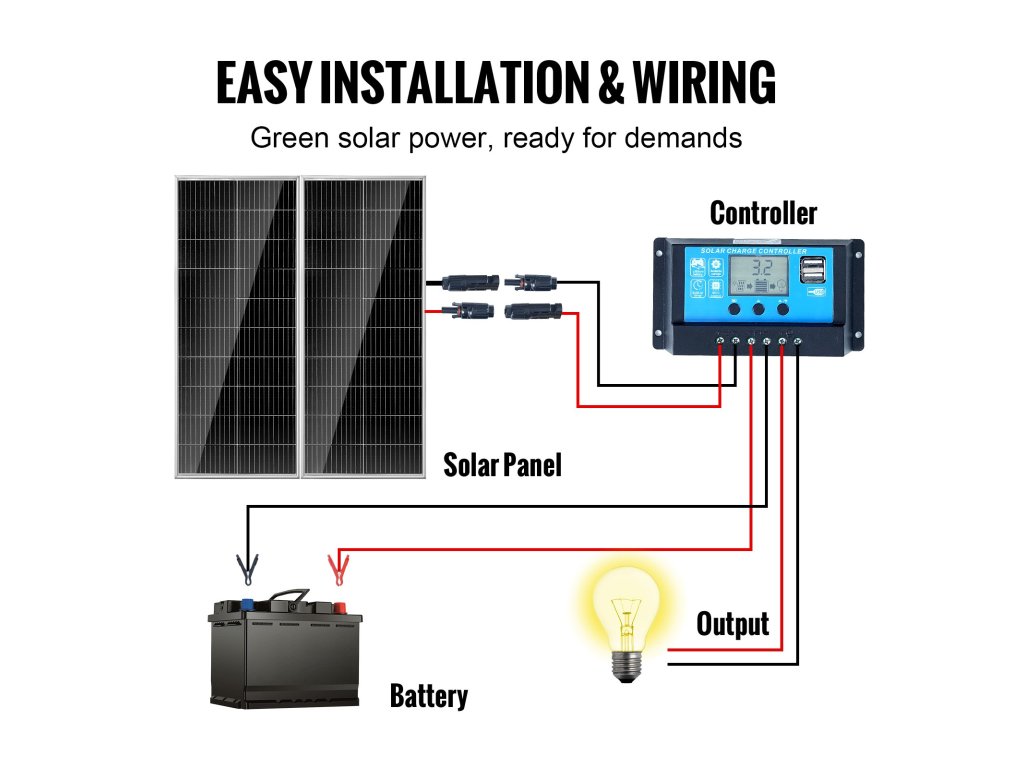 Javítsa életmódját a VEVOR 2PCS x 100W monokristályos napelemekkel + töltésvezérlővel. A monokristályos napelemekkel és a magas, több mint 23%-os energiaátalakítási rátával az otthoni, lakóautó, jacht és kemping eszközök áramellátását biztosítja, kompatibilis a különböző AGM, GEL, FLD és LI akkumulátorokkal.