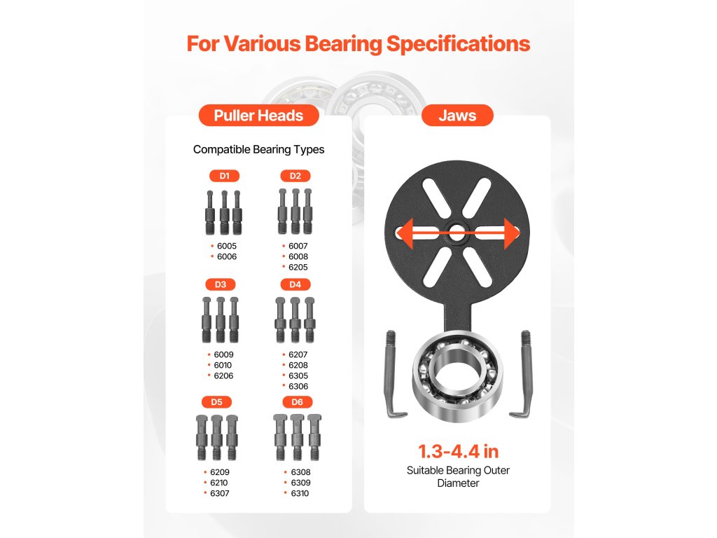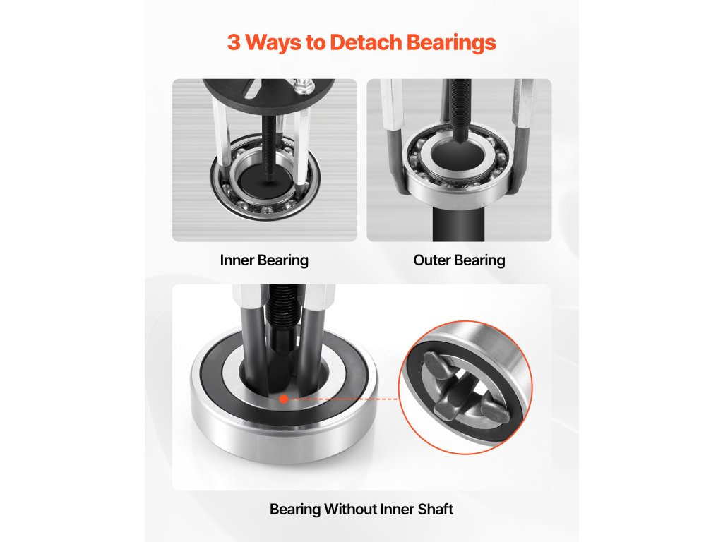 Ez a csapágyeltávolító készlet csavaros távtartó alátéteket tartalmaz, amelyek kiszélesítik a csavar érintkezési felületét, és segítenek a csapágyak hatékonyabb eltávolításában.