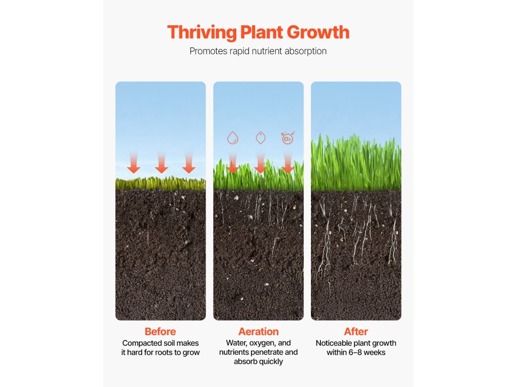 Ez a kézben tartott mobil gyepszellőztető lazítja és levegőzteti a talajt, hogy elősegítse a mély, egészséges gyökerek és a dús, élénk gyep kialakulását. Javítja a talajszerkezetet és ideális növekedési környezetet teremt a növények nagyobb életereje érdekében.