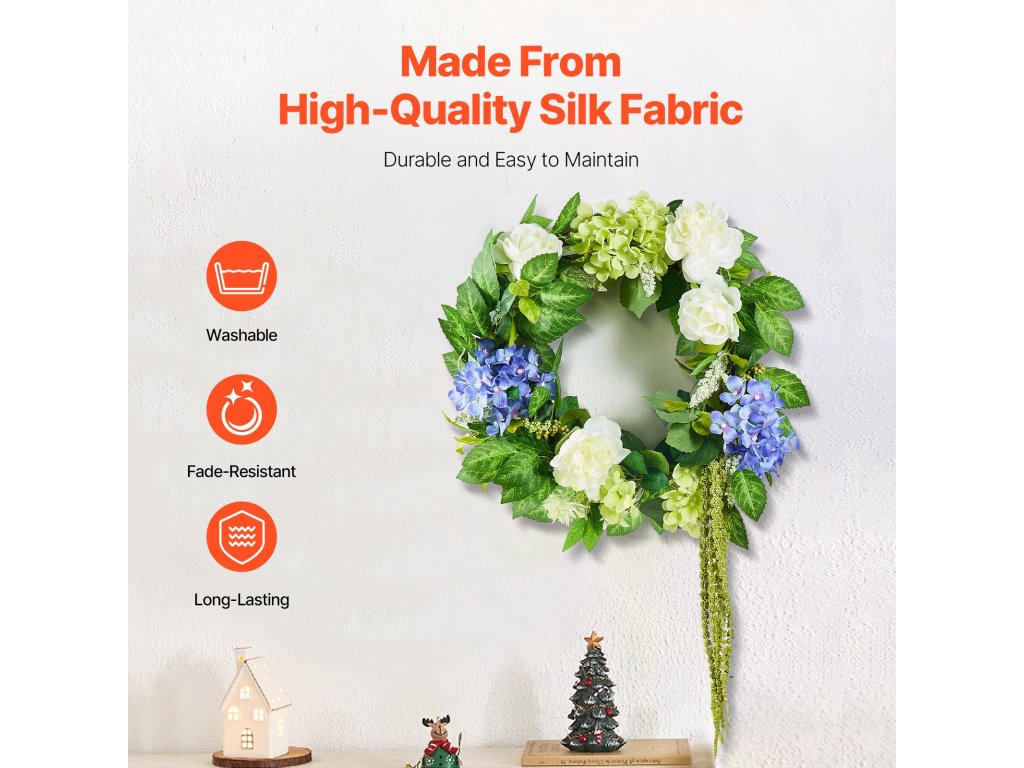 A kiváló minőségű selyemszövetből készült bejárati ajtókoszorú felülete sima és porálló, így az idő múlásával nem fakulnak ki a színek. Nedves ruhával óvatosan letörölhető vagy mosható, így alkalmas hosszú távú díszítésre különböző környezetekben.