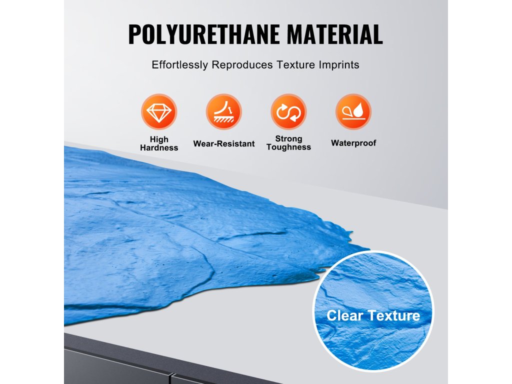 A prémium minőségű poliuretánból készült, kopásálló és rendkívül kemény, rugalmas hajlításra képes, miközben megtartja szilárdságát, így ideális a hosszú távú betonbélyegzéshez.