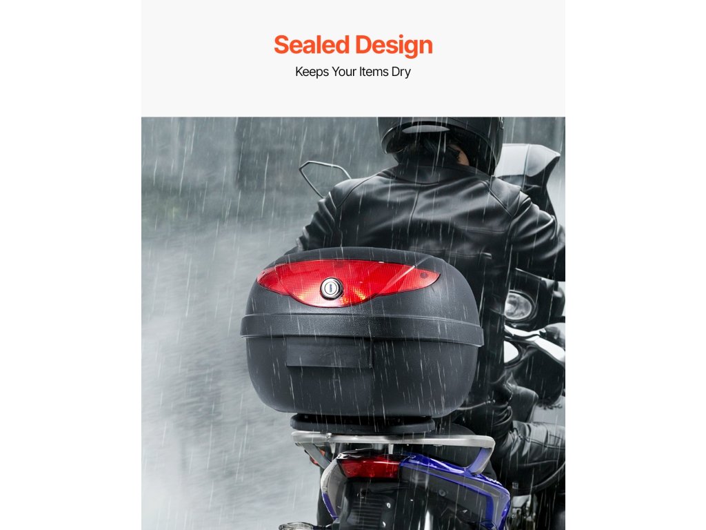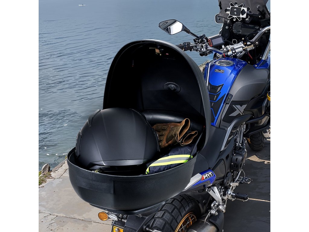 A zárt kialakításnak köszönhetően a motorkerékpár tetőcsomagtartóban lévő tárgyak szárazon és biztonságban maradnak, így bármilyen időjárás esetén gondtalanul motorozhat.