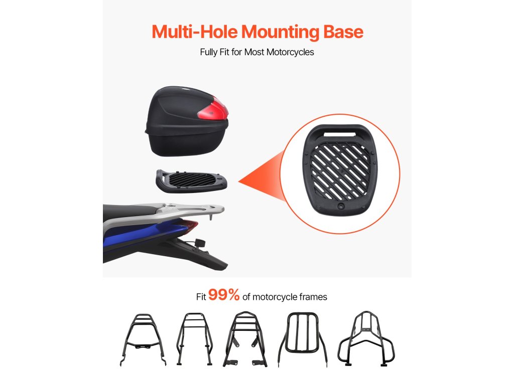 Az alap több lyukú kialakításának köszönhetően a különböző motorkerékpár-állványok befogadására alkalmas, így a telepítés egy személy számára is gyors és egyszerű. Nem kell aggódnia a bonyolult beállítás miatt, csak szerelje fel és mehet!