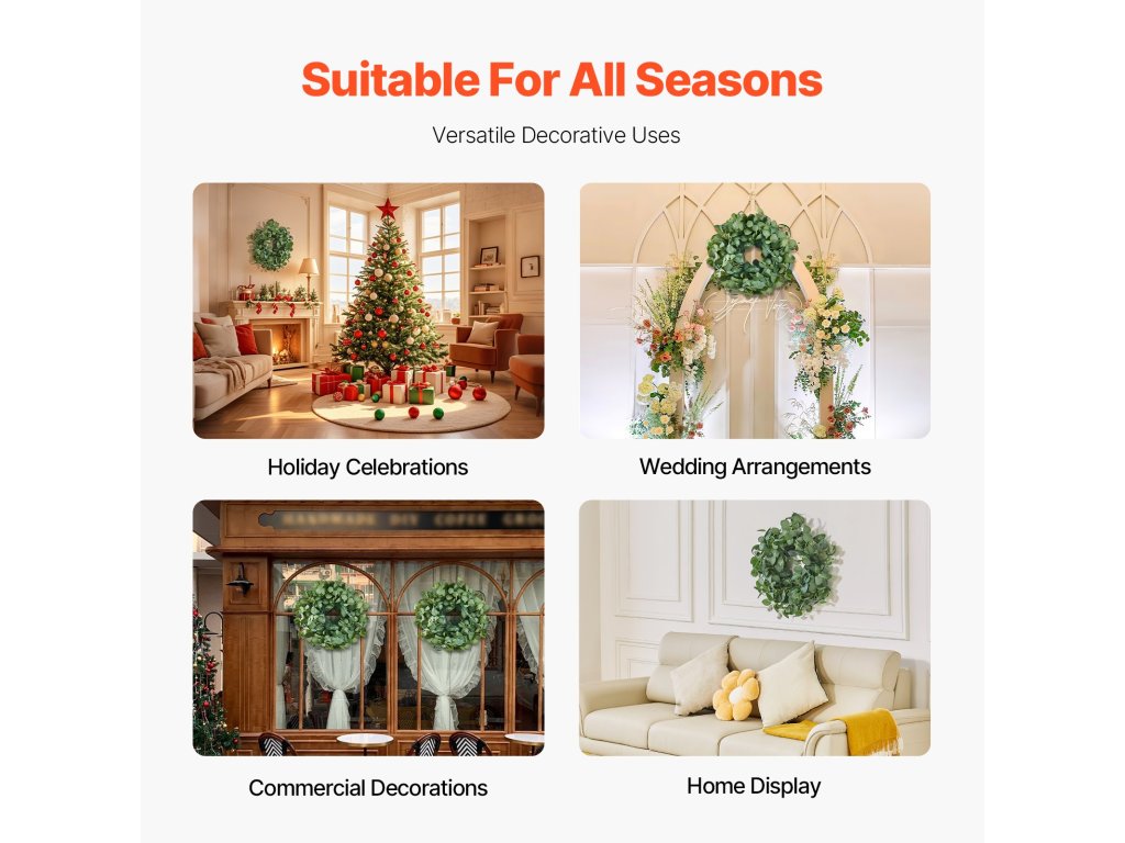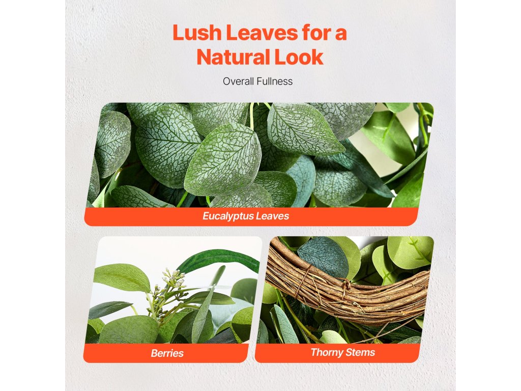 A körülbelül 26 hüvelyk külső átmérőjű műkoszorú ideális előcsarnokok, nagy nappalik, banketttermek, szabadtéri kertek és egyéb otthoni terek díszítésére, természetes eleganciát kölcsönözve.