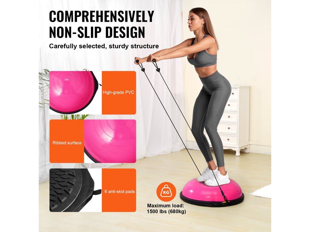 A stabilitási labda kiváló minőségű PVC anyagból készült, csúszásmentes textúrával. A csúszásmentes és kopásálló alap 6 csúszásmentes lábbal párosul a stabilitás növelése érdekében. Az anti-burst technológia biztonságos élményt nyújt a deszkára lépéstől, a lungoktól a fogantyúkig.