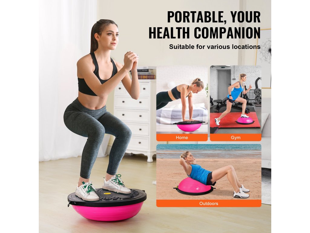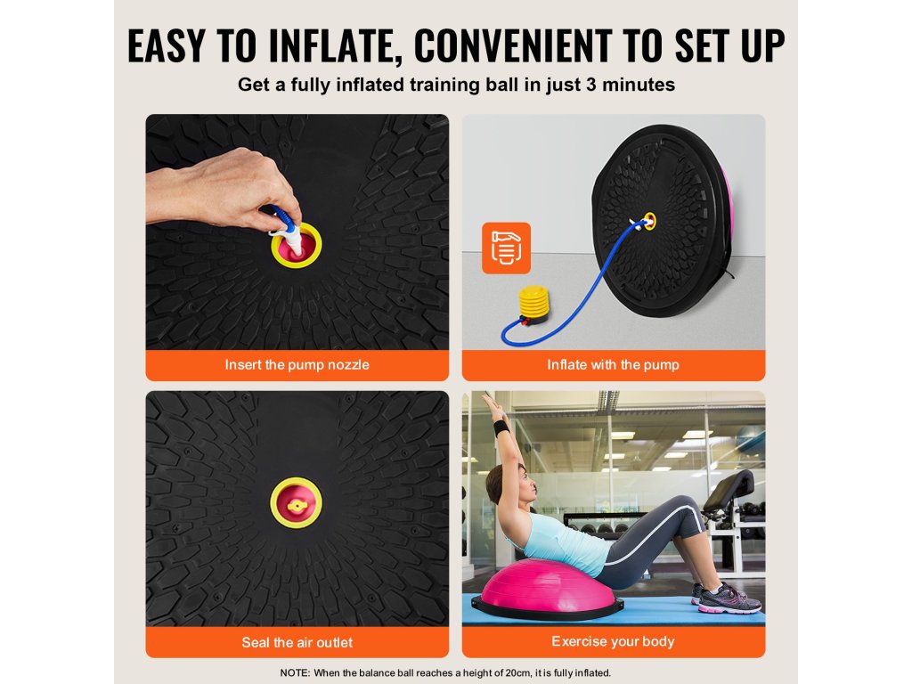 A fél jógabál gyorsan és egyszerűen telepíthető. Egyszerűen csatlakoztassa a labdát, és a töltéshez lépjen rá a mellékelt lábpumpa segítségével. Egy perc alatt felfújódik, és másodpercek alatt leereszt. A tartozék lábpumpa a gyors felfújáshoz, a kiváló minőségű légszelep megakadályozza a szivárgást, hosszú élettartamot biztosítva.