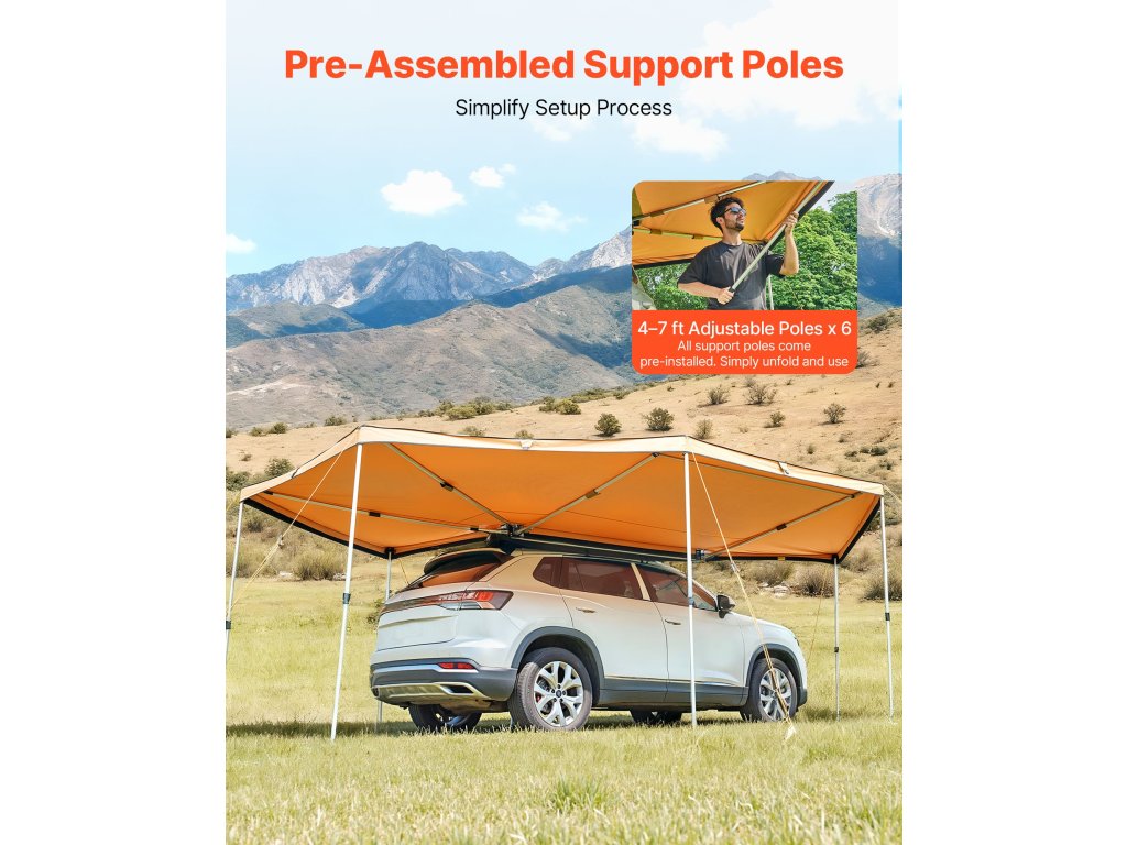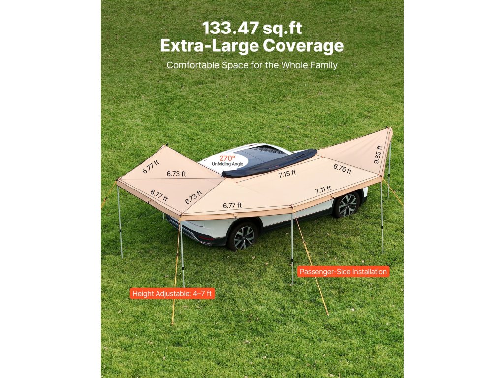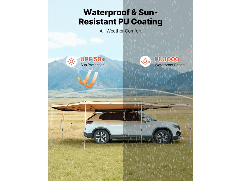 270°-os széles látószögű kialakításával és 6,89 m magasságával ez a jármű oldalsó napellenzője bőséges lefedettséget biztosít, és védelmet nyújt az UV-sugarak, a szél és a víz ellen. Könnyedén rögzítheti járműve oldalára, és gyorsan felállíthatja kempingezéshez vagy piknikezéshez bármilyen időjárás esetén.