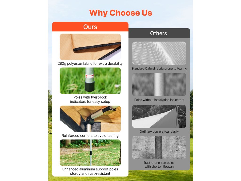 A kihúzható kialakítás előre beszerelt vízszintes és függőleges tartó rudakkal rendelkezik, így a tárolástól a kicsomagolásig zökkenőmentes a felállítás. Kövesse az utasításokat a napellenző kibontásához a gyors felállításhoz. Mondjon búcsút a bonyolult lépéseknek. Tökéletes kempingezéshez vagy piknikezéshez percek alatt.
