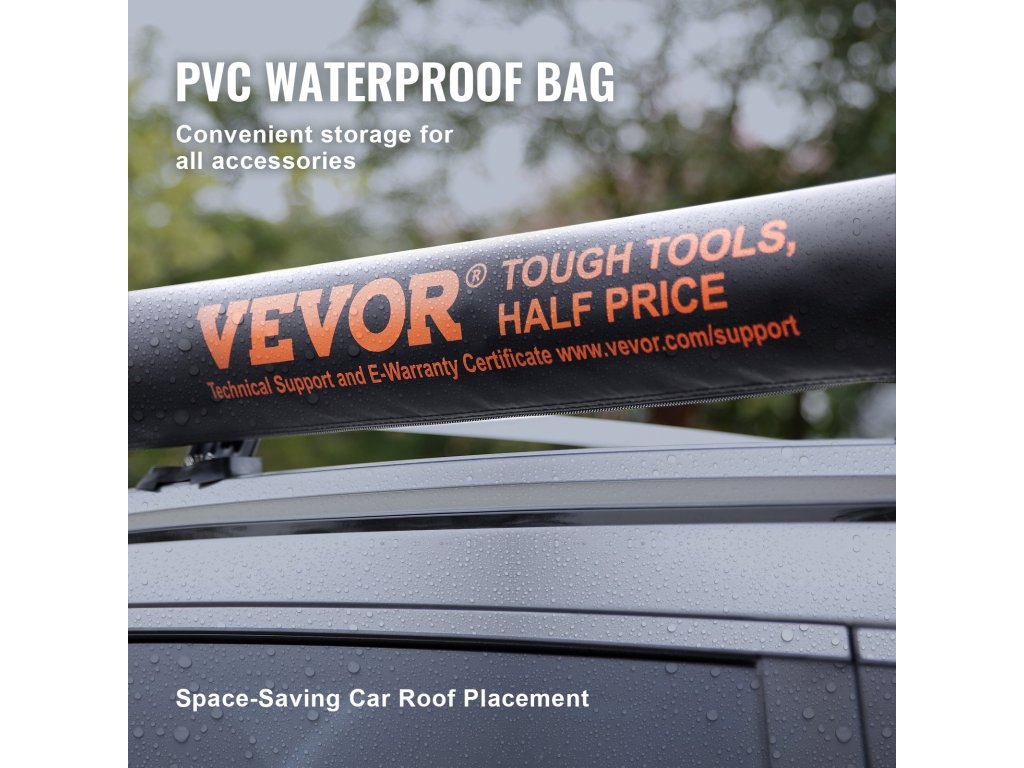 A 102,4 × 6,7 × 3,9 hüvelyk/260 × 17 × 10 cm-es teljes méretekkel táskánk nem foglal sok helyet az autó tetején. A PVC anyag kiváló vízállóságot biztosít, így még esős napokon sem kell aggódnia az esővíz beszivárgása miatt.