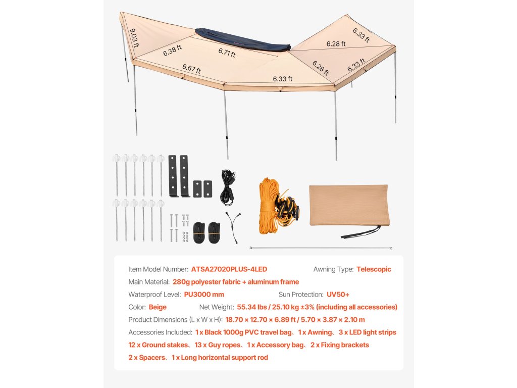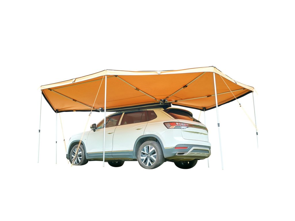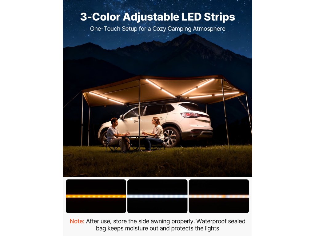 Ez a jármű oldalsó napellenző 270°-os széles látószögű kialakítással és 6,89 m-es magassággal rendelkezik, és nagyvonalú fedést nyújt UV-, szél- és vízvédelemmel. Könnyen rögzíthető a jármű oldalára a gyors, minden időjárási körülmények közötti kempingezéshez, piknikezéshez vagy szabadtéri felállításhoz.