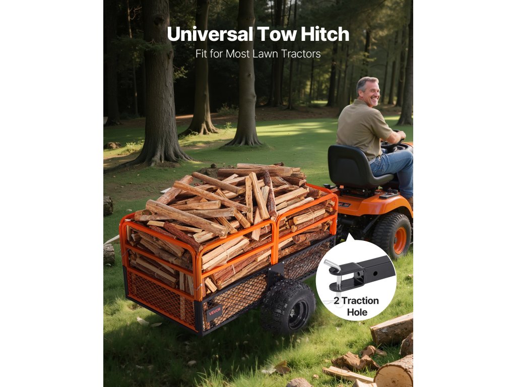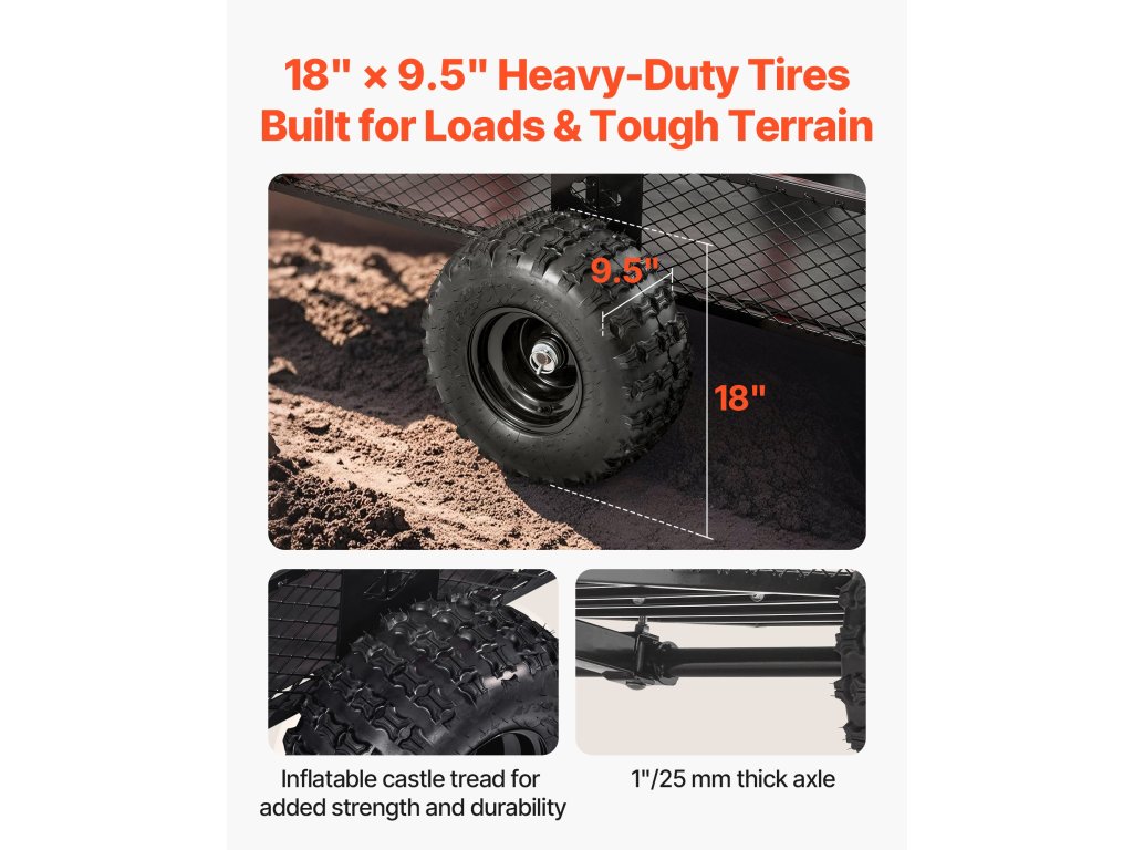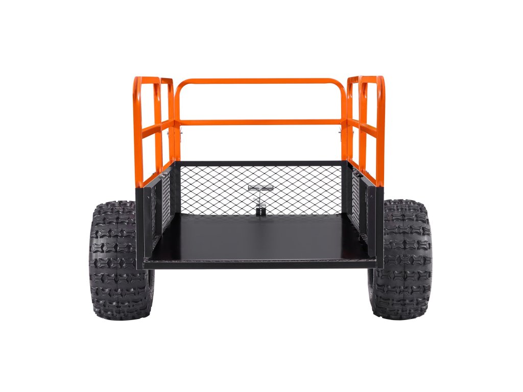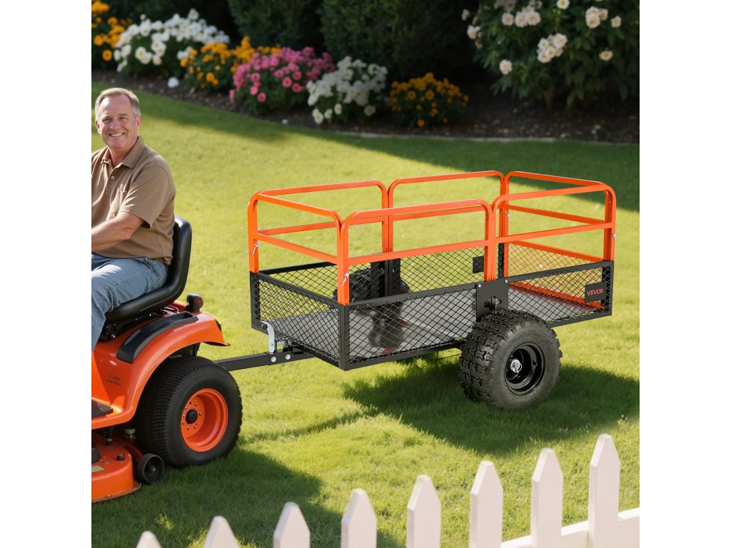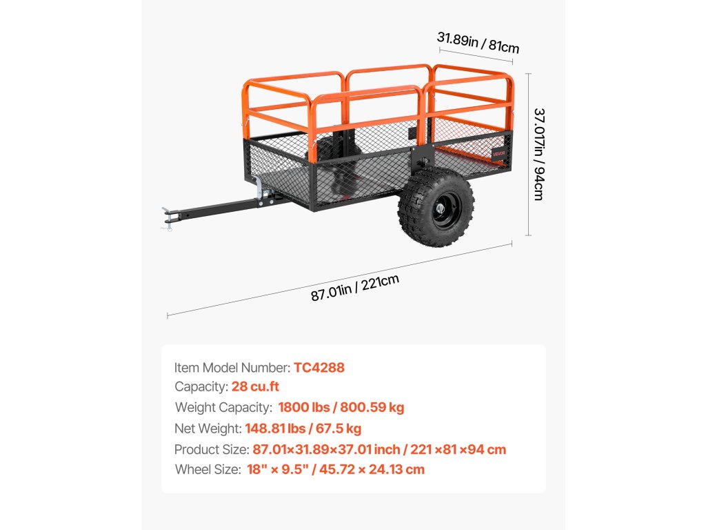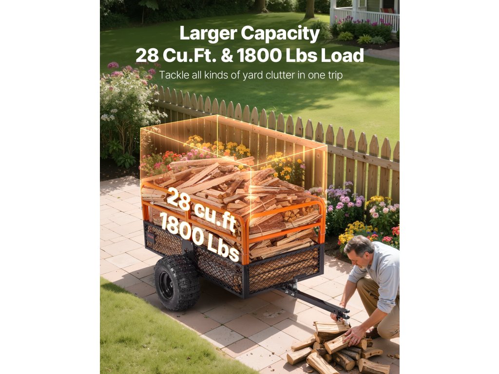 Ez az 1800 font súlyú kerti pótkocsi alkalmas traktorok, ATV-k, fűnyírók és egyéb eszközök szállítására. Acélvázzal, korrózióálló festékkel, megerősített támasztórudakkal és gumiabroncsokkal rendelkezik, 1800 font teherbírást és 18 m3 teret kínál. A 28 hüvelyk átmérőjű gumiabroncsok sima mozgást biztosítanak a fűben és a sárban, kerti munka és takarítás közben.