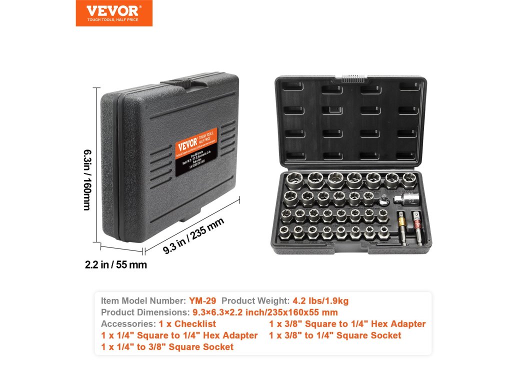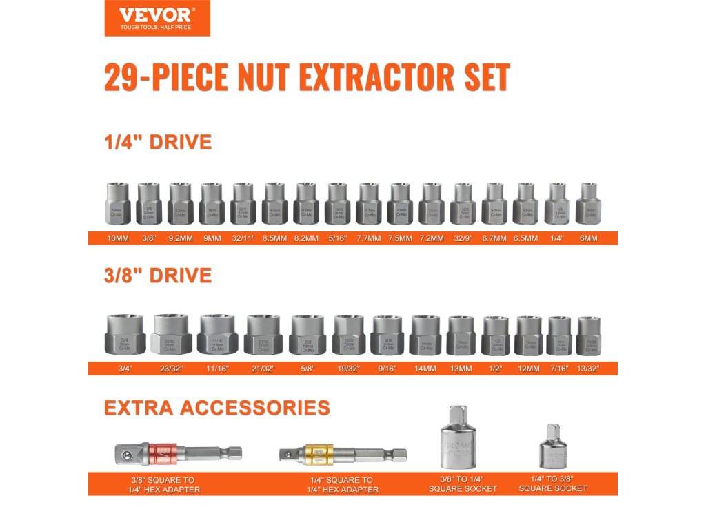 A 29 darabos, többcélú csavarhúzó készlet ideális otthoni felújításokhoz, autójavításokhoz és barkácsprojektekhez. Segítségével könnyedén eltávolíthatja a beragadt vagy rozsdás anyákat és csavarokat. Nagy keménységű acélból készült, így szilárd fogást biztosít törés vagy deformáció nélkül.