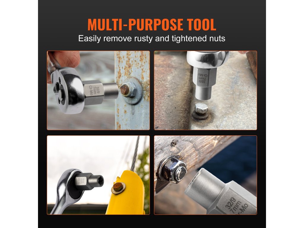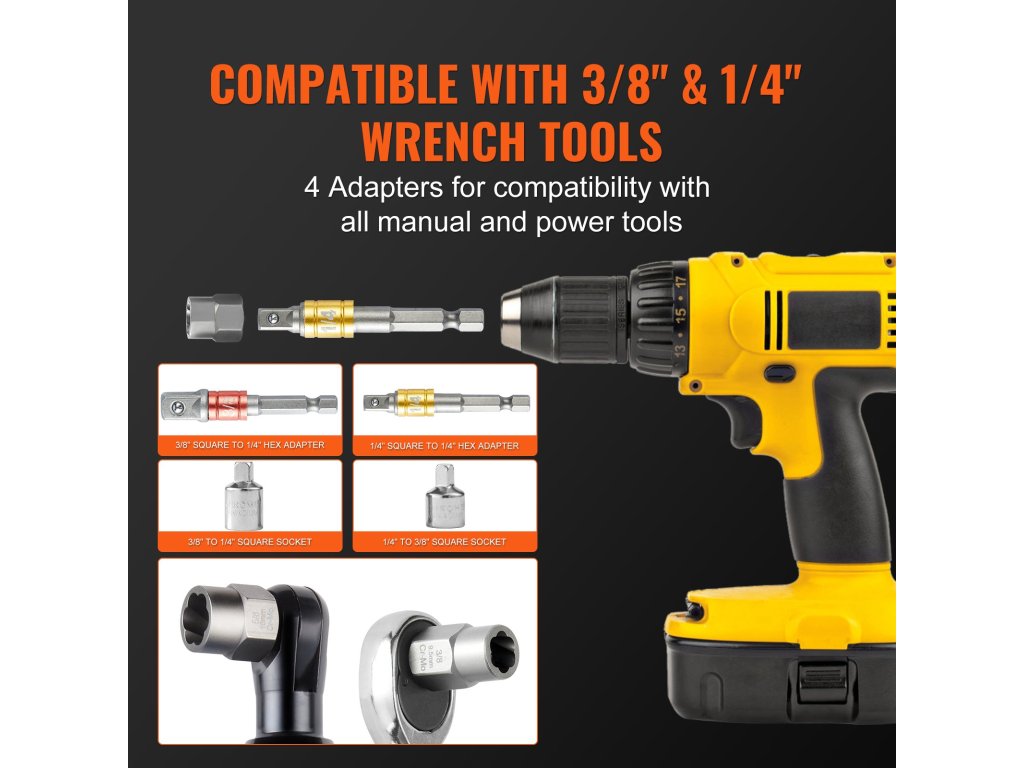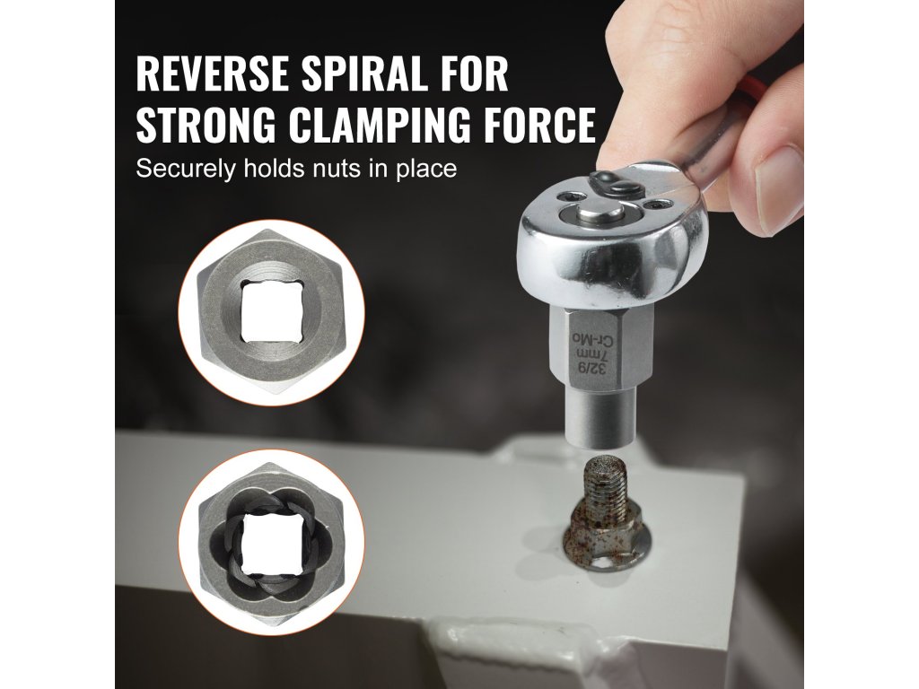 A csavarhúzónk kompatibilis a 3/8" és 1/4" kézi vagy elektromos szerszámokkal, például állítható csavarkulcsokkal, racsnis és elektromos csavarkulcsokkal. A fordított menetes kialakítás biztosítja a rozsdás vagy meghúzott anyák biztonságos eltávolítását, csökkentve a csúszást.