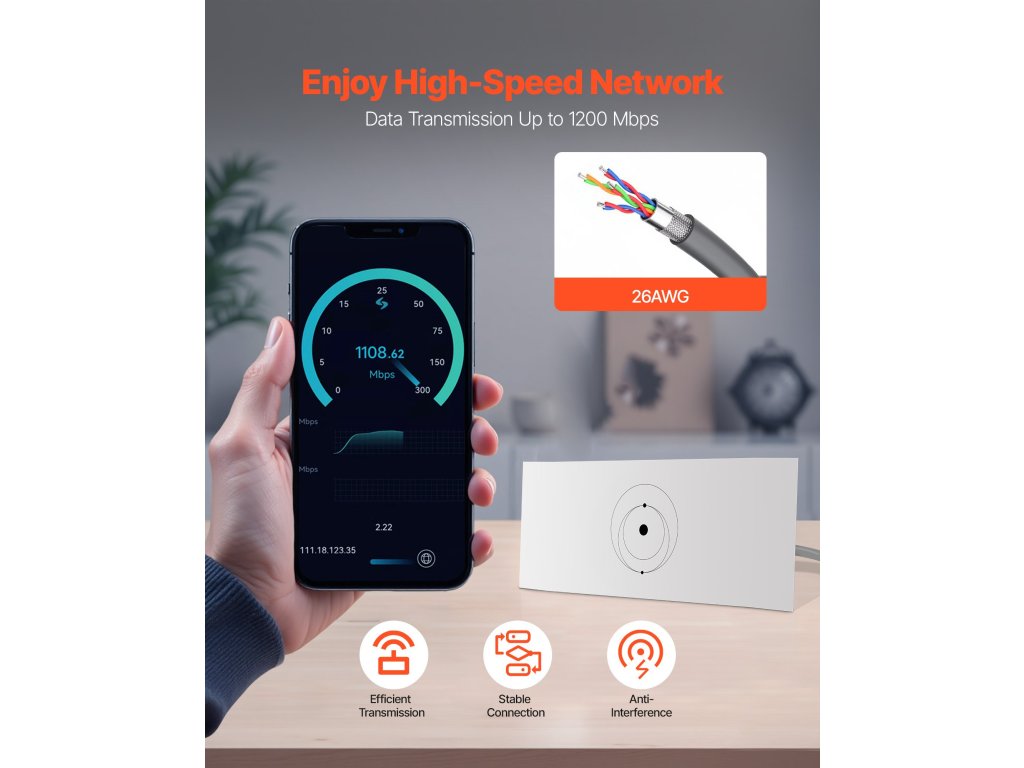 Ez a Starlink kábel CAT6 szabványú, 26 AWG tiszta rézmaggal és fém árnyékolással rendelkezik a kiváló interferenciavédelem érdekében. Akár 1200 Mbps sebességet is biztosít, így több eszköz csatlakoztatása esetén is zökkenőmentes teljesítményt nyújt. Megbízható társ streaminghez, játékhoz vagy távmunkához.