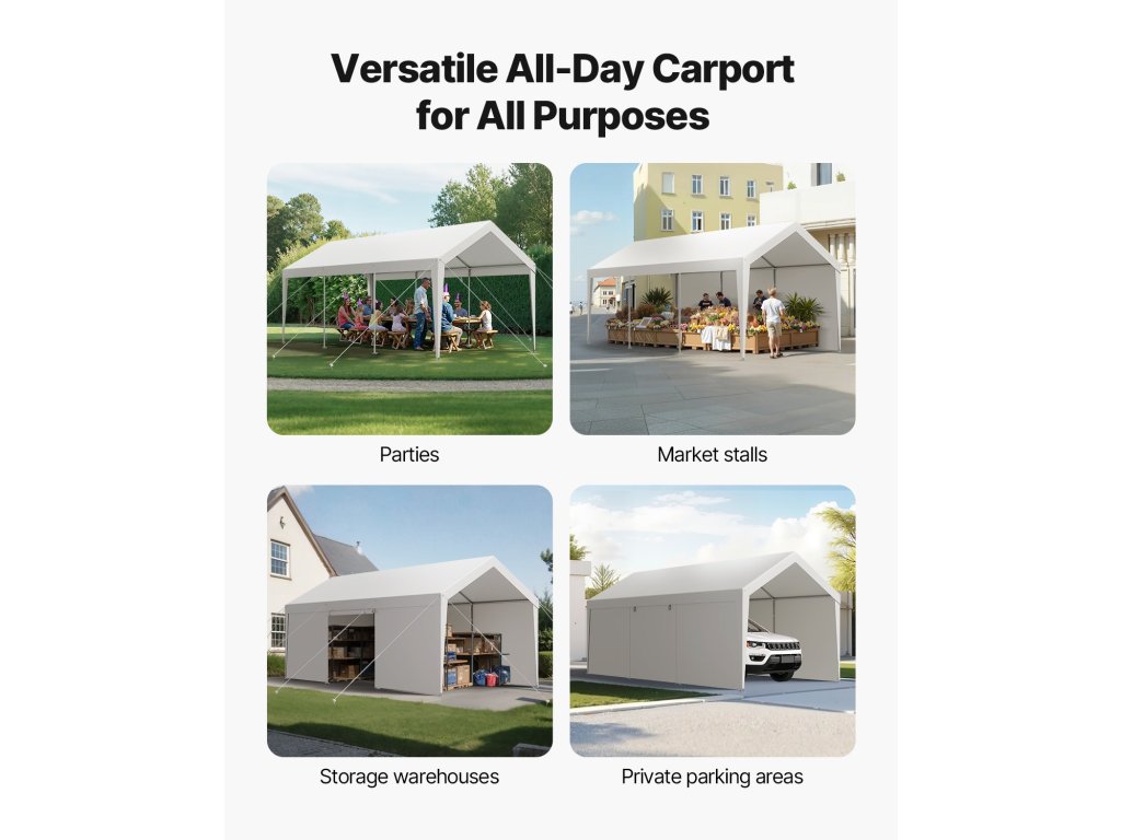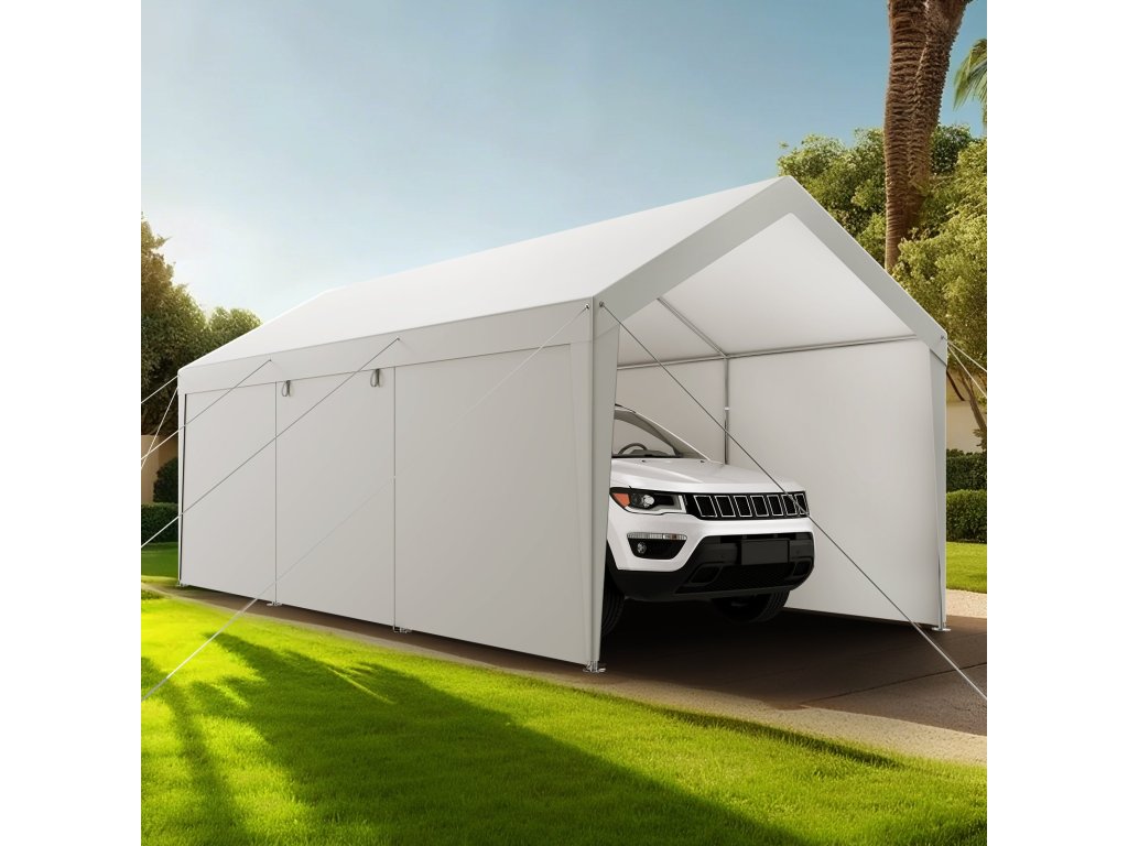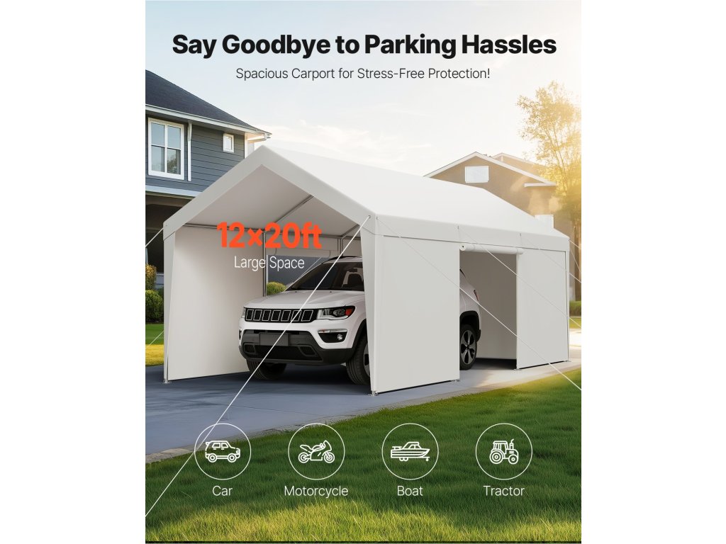 A hordozható garázs 12×20 láb alapterületű, horganyzott acélvázzal és PE-bevonatú, kétrétegű ponyvával rendelkezik, amely egész évben védelmet nyújt a nap, az eső és a szél ellen járműve és kültéri tárgyai számára. Gyorsan összeszerelhető és hosszú élettartamú konstrukció, Ideális garázsba, tárolóhelyre vagy szabadtéri tevékenységi területre.