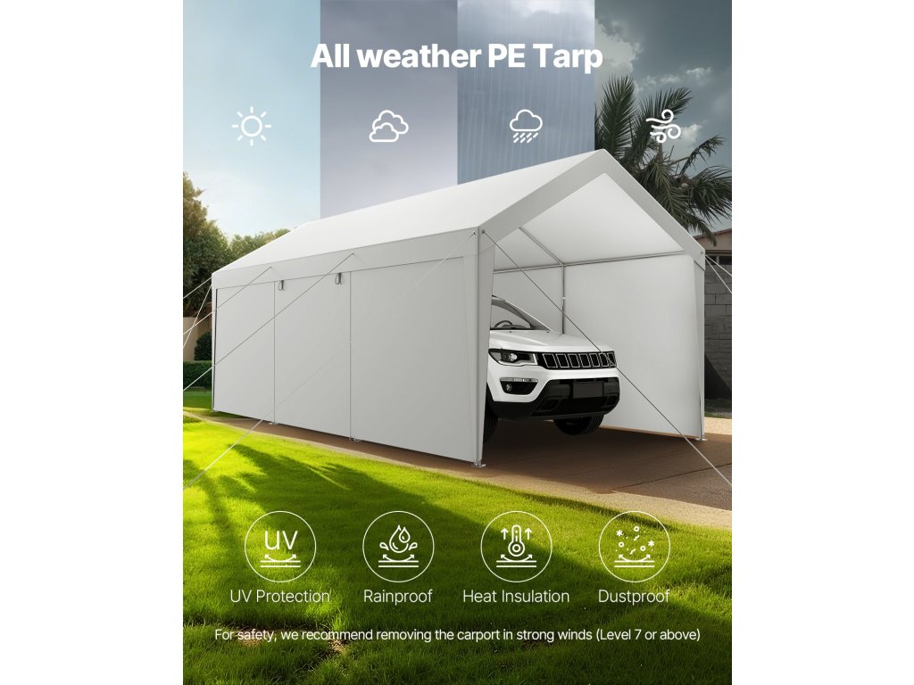 A kiváló minőségű PE-szövetből készült hordozható garázs egész évben védelmet nyújt a napsugarak, az eső, a hó és a homokviharok ellen. Legyen szó intenzív napsütésről, heves esőzésről vagy téli havazásról, a garázs száraz és tiszta marad, és védelmet nyújt járművének.
